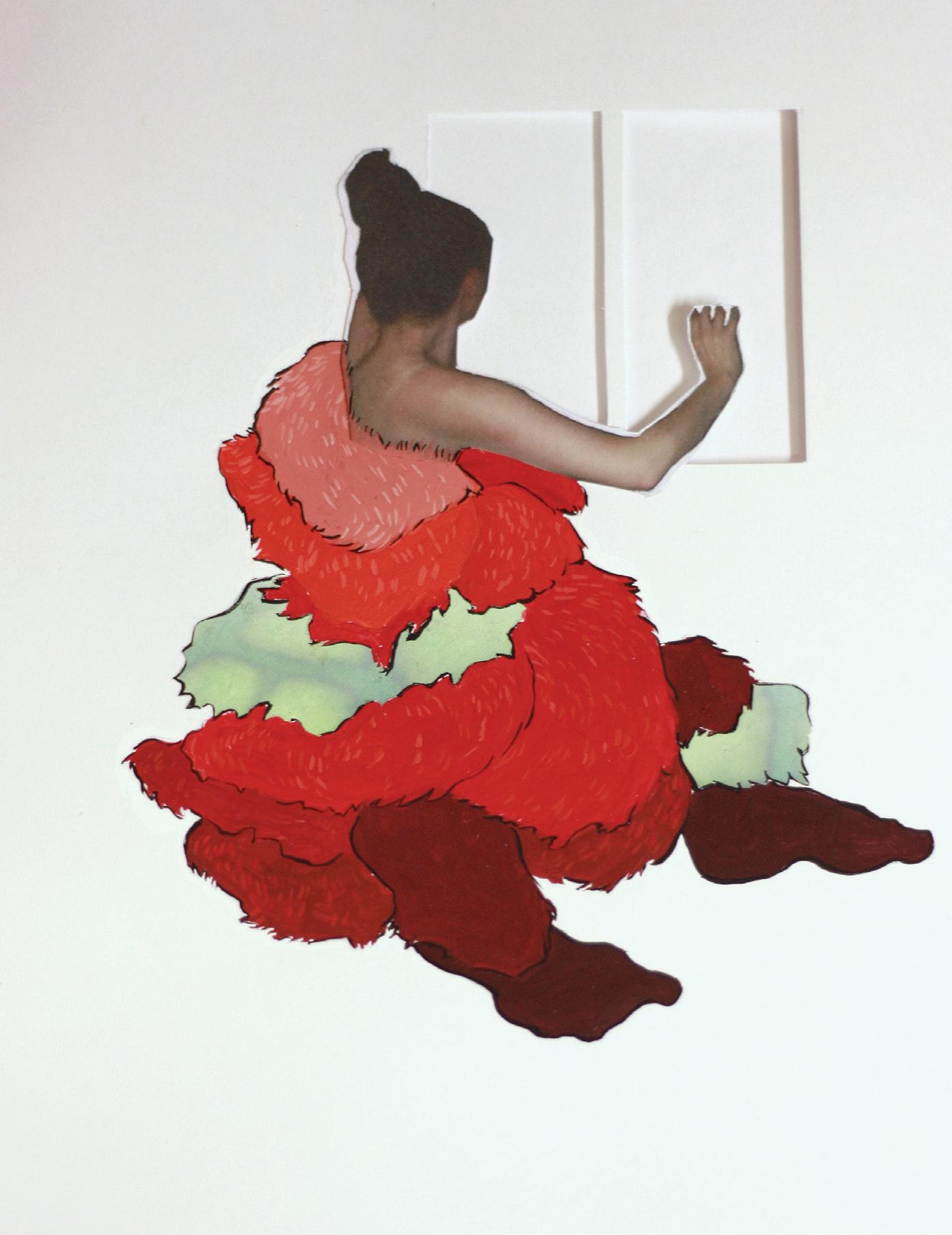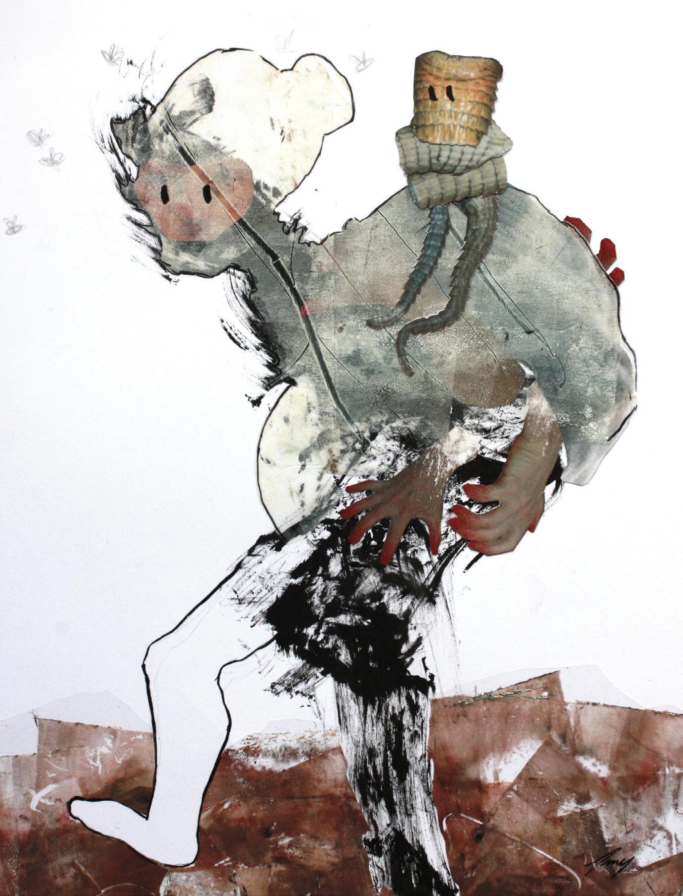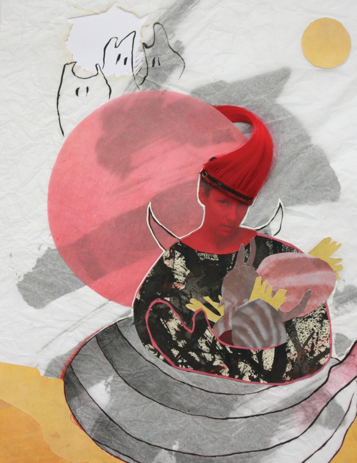 Tissue paper, ink, pencil crayon, inkject print, acrylic, charcoal on paper. 8.5x11 in.