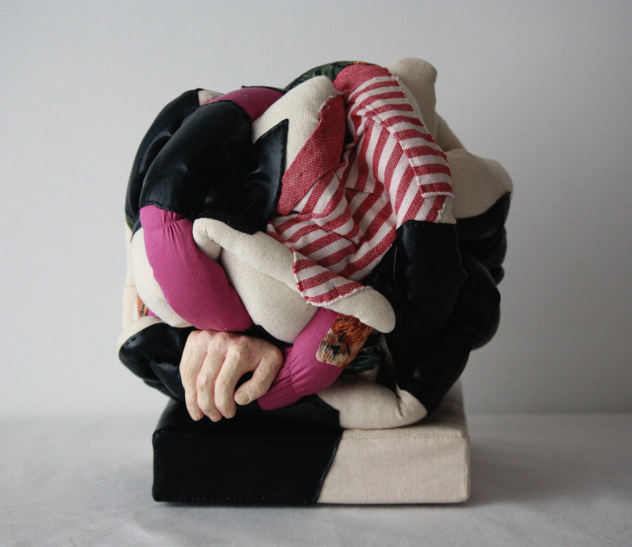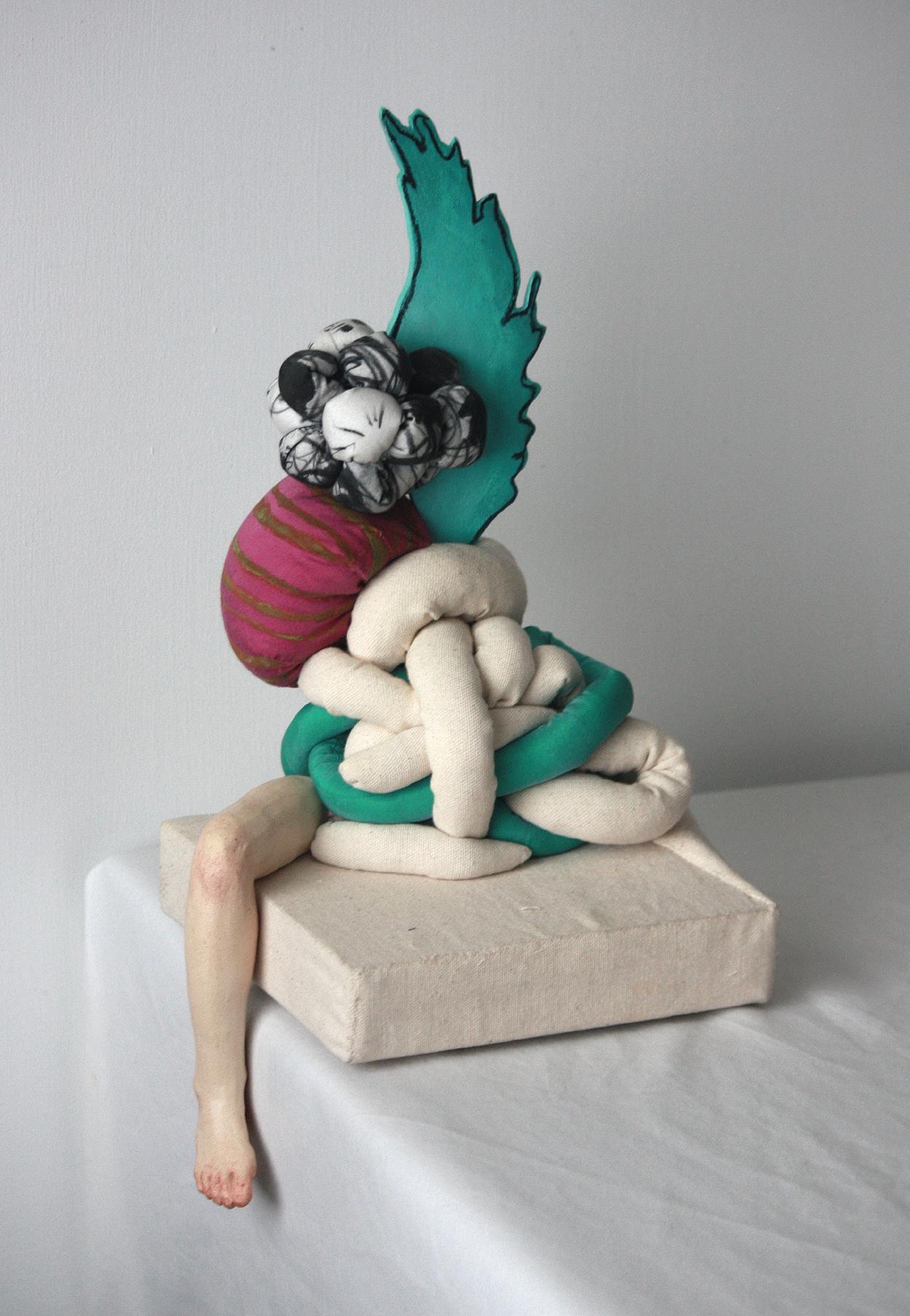 Starling with Knot, 2023. Reclaimed fabric and oil paint on wood. 14x7x12 in.