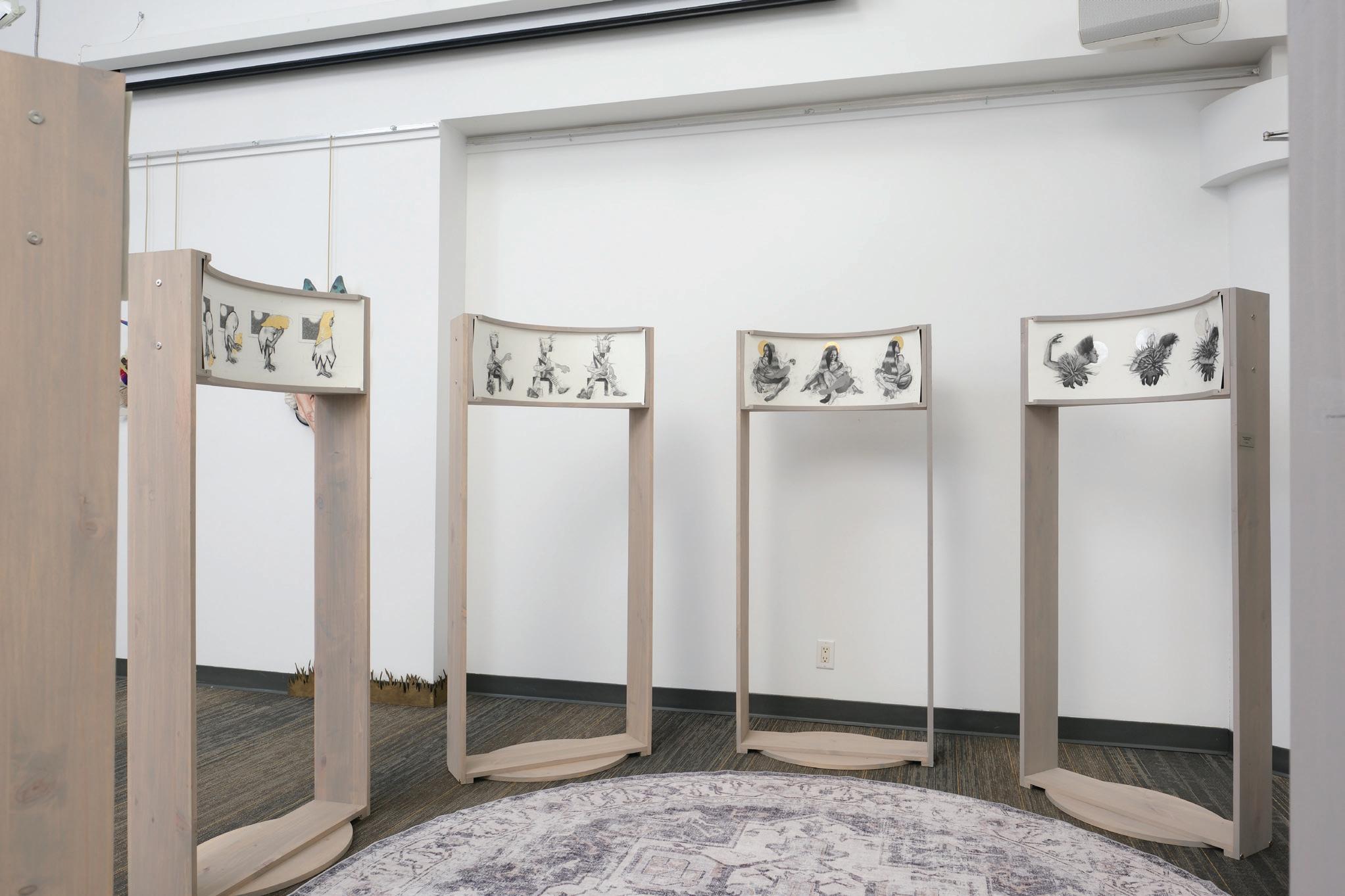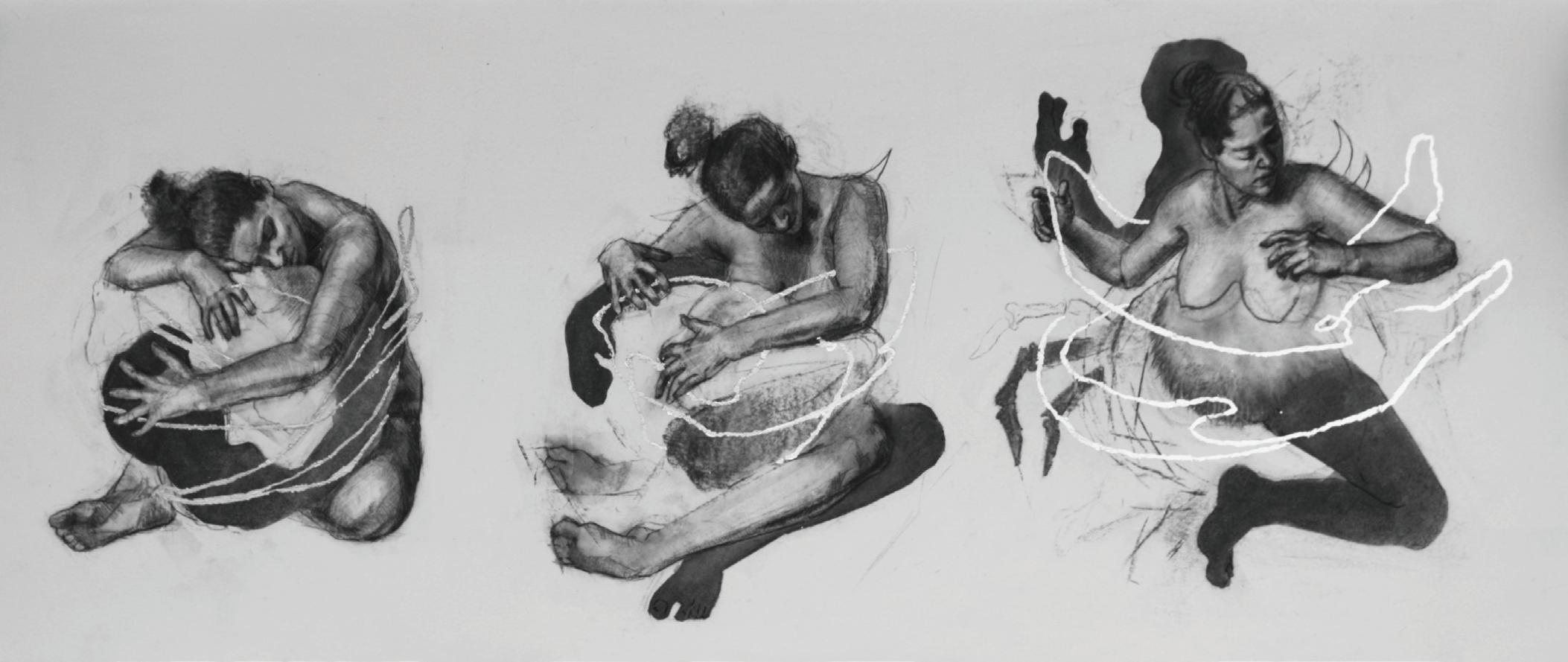 The space is simple and small, like mine was over these months. The drawings themselves are curved in order to invite you, the viewer, to inch closer. When you do, the paper will appear to flatten, the distortion will dissipate, and you will see the figures more accurately and intimately. This closeness will open to you to the nuance and detail that may have been hidden had you tried to view them from a safe distance. It takes courage to look at others, and at ourselves, closely. Maybe you will see yourself in these characters the way I did, and also recognize in their movements the ways that you, too, can adapt, evolve, and find strength in unconventional ways.
