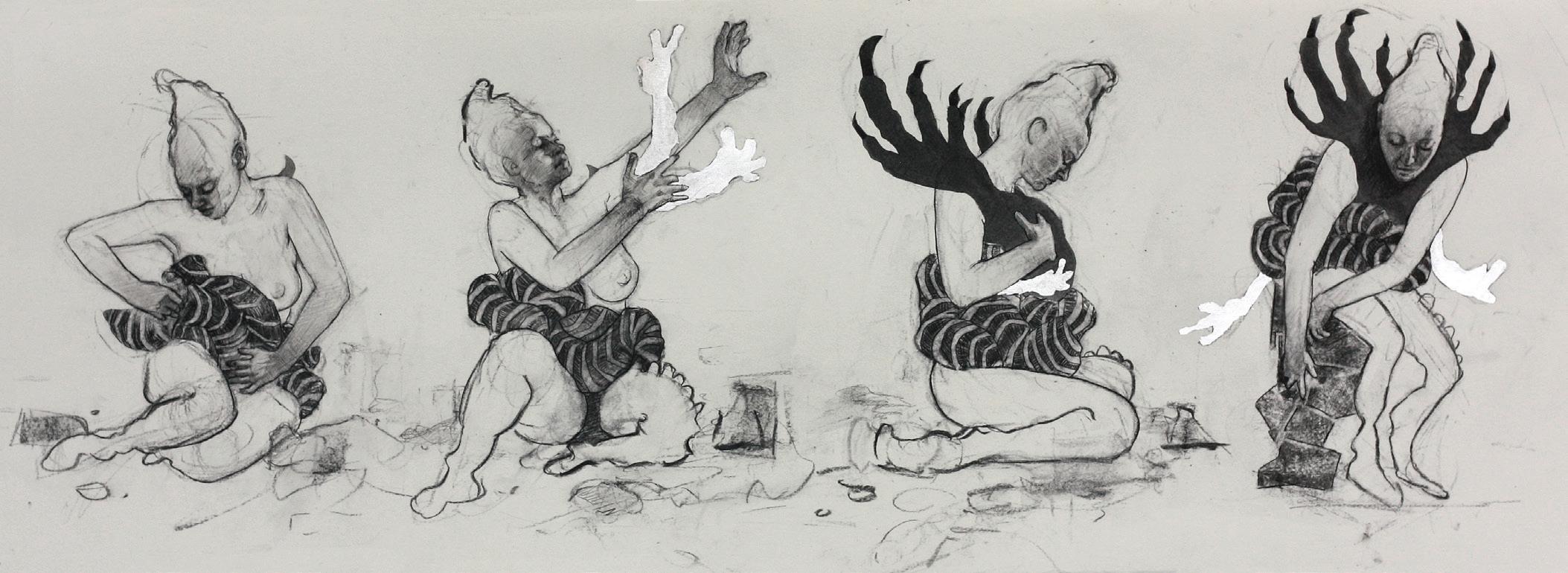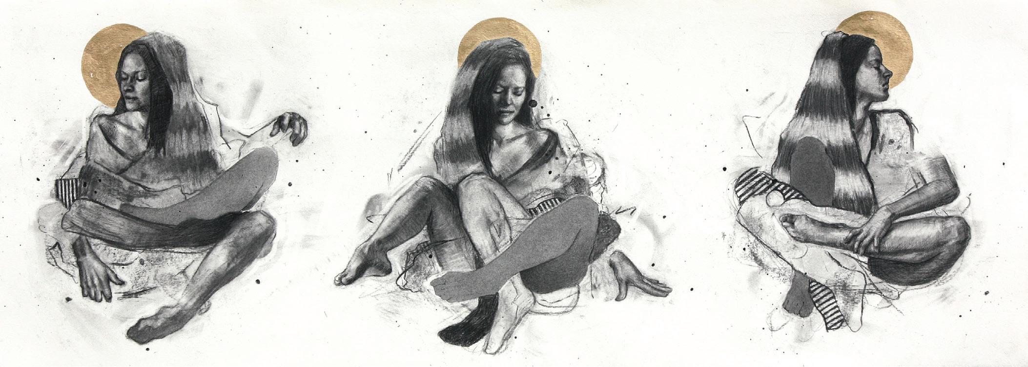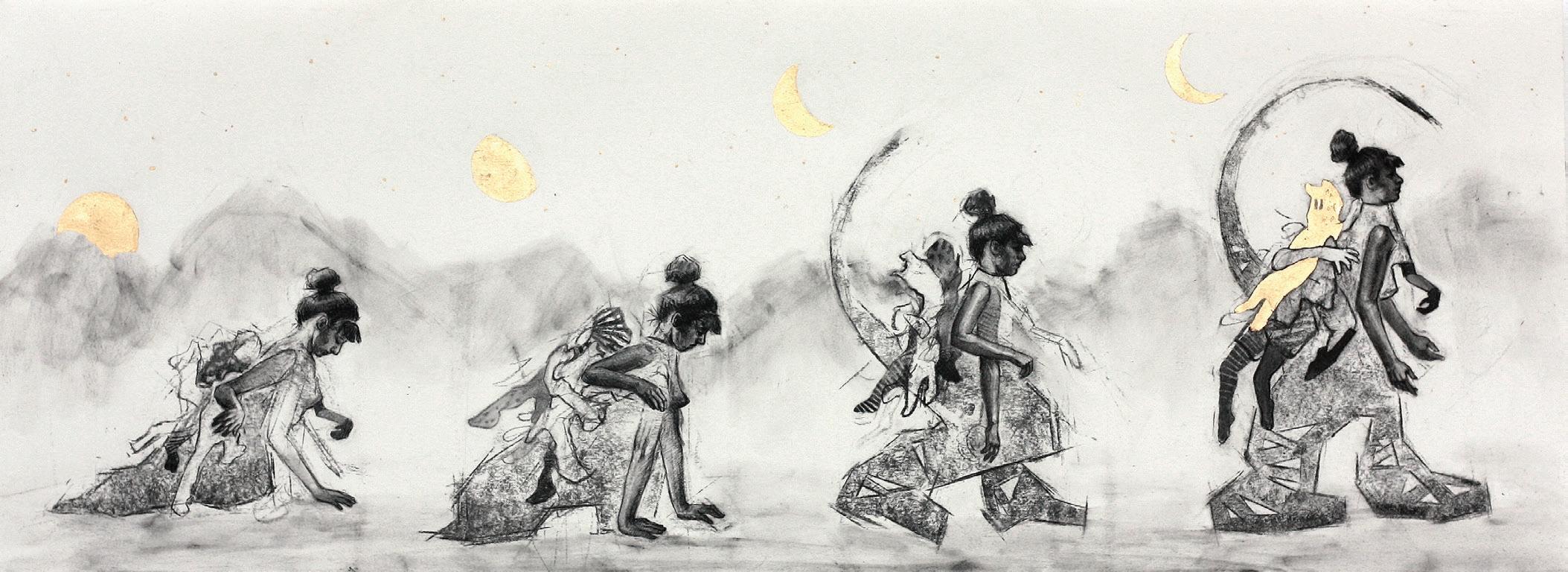 Mothering, 2024. Charcoal and 23 ct gold leaf on paper. 11x30 in.