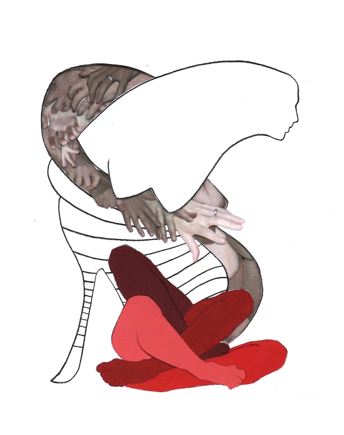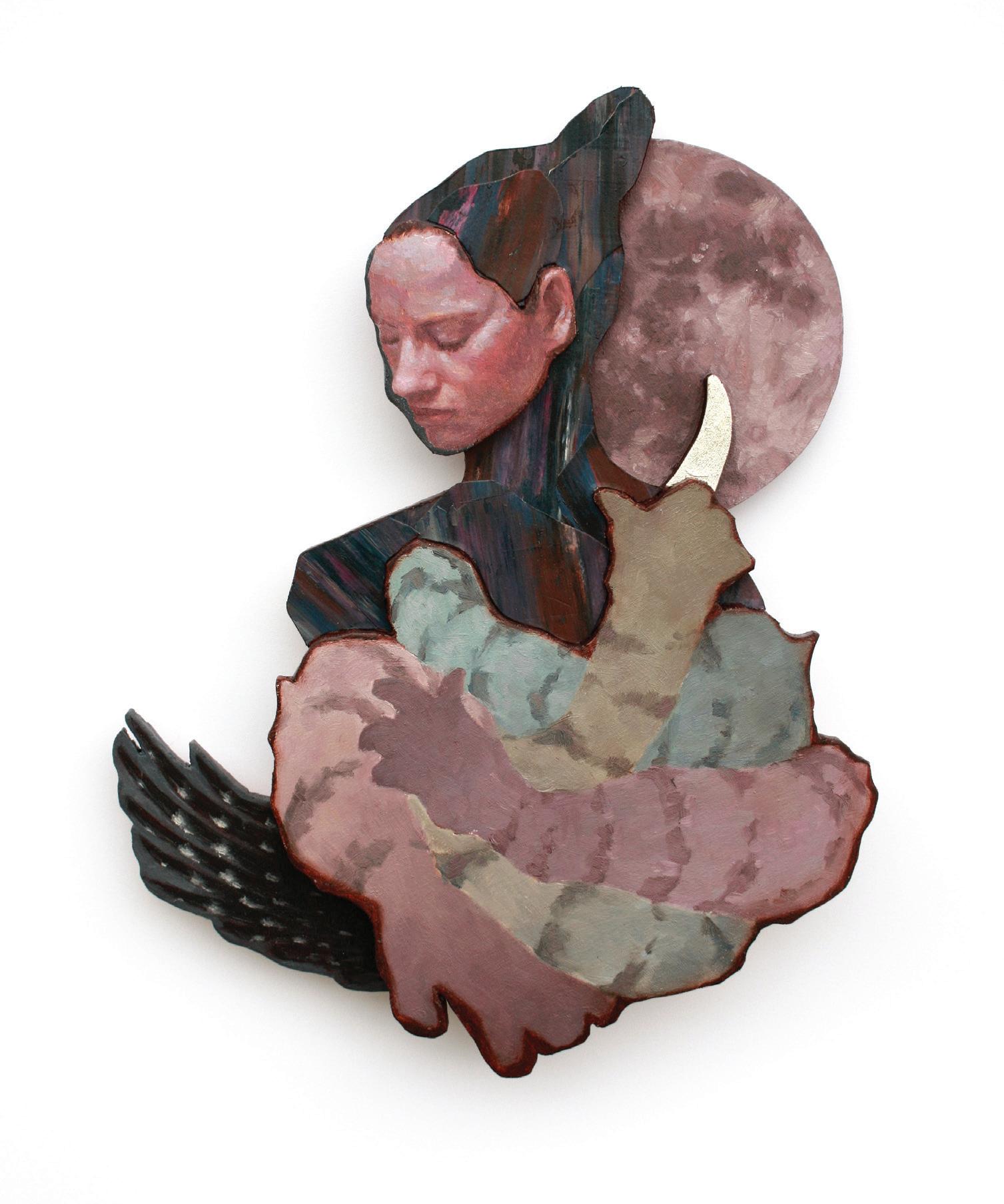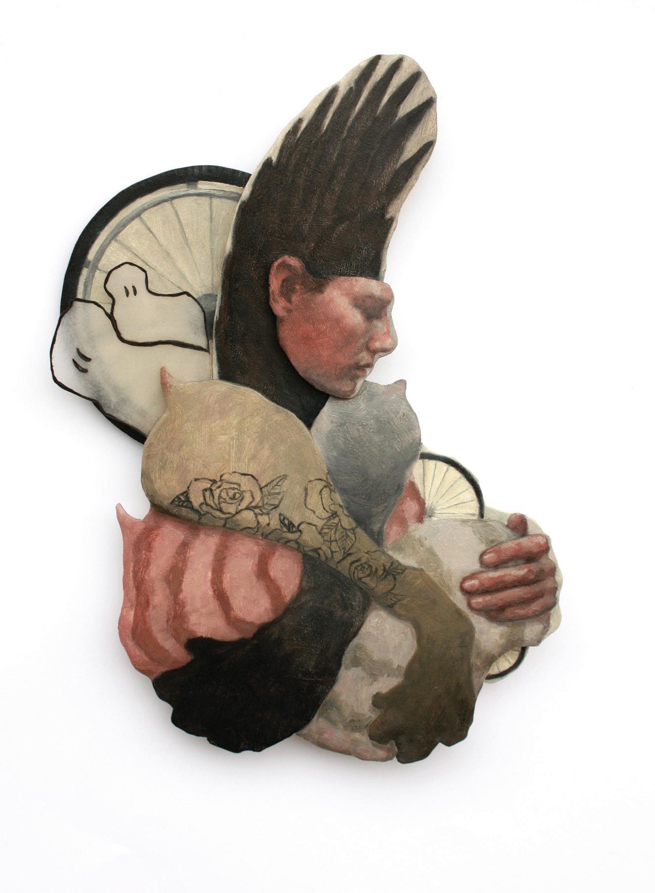 Layering fragments, erasing, and adding more layers in different media is a temporal process that can serve as a metaphor for the process by which the body reveals its new and changing realities. It is also a way to explore and test ideas before they are presented in larger works. In Wings and Wheel Dyck contrasts flight – wings attached to her forehead, covering her eyes - with immobility –a discombobulated wheelchair is ineffective in the artist’s clawed hands. Dyck revisits these ideas in Wheel and Wings (pg. 27), using oil paint and reclaimed fabric on wood to create a larger and more robust three-dimensional collage. Here there is much greater tension as Dyck has layered the fragmented body parts with greater precision, relegating the sharp talons to the background, and adding a small rabbit (the family pet) crawling up her leg. She is powerless to brush it off, but she may not want to reject this small creature whose fight/freeze/flight reflexes so closely mirror ours.