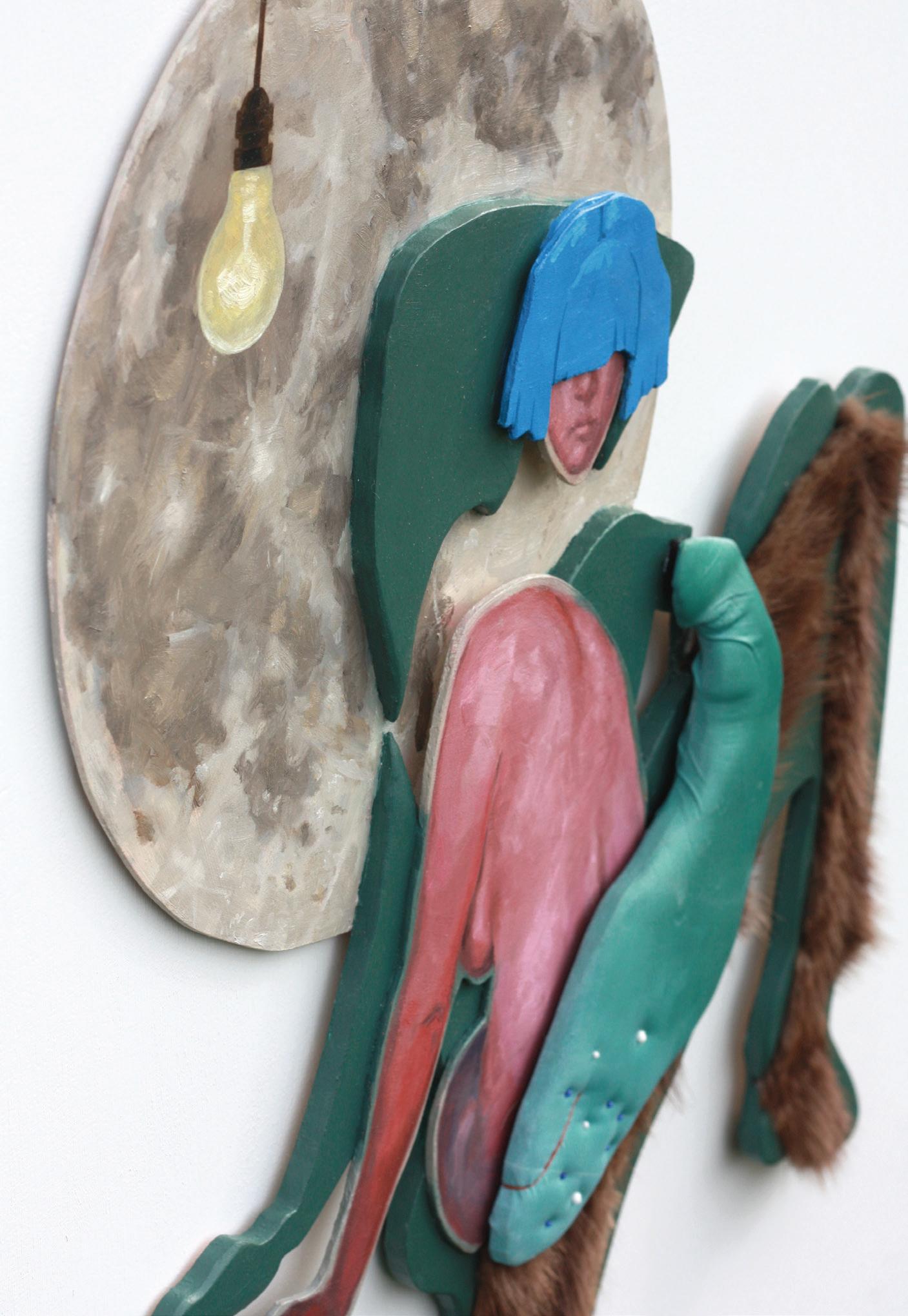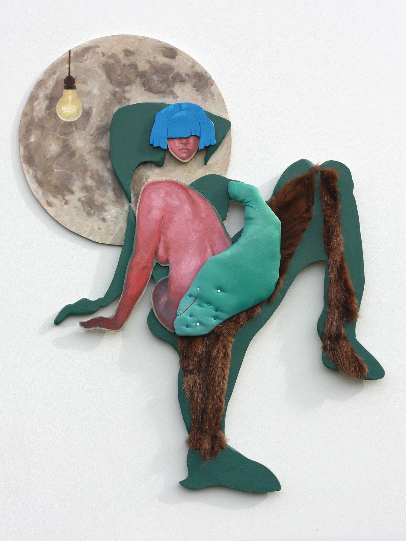 Moon with Lightbulb, 2024. Oil paint, reclaimed fur, and fabric with beads on wood. 21x29x1 in.