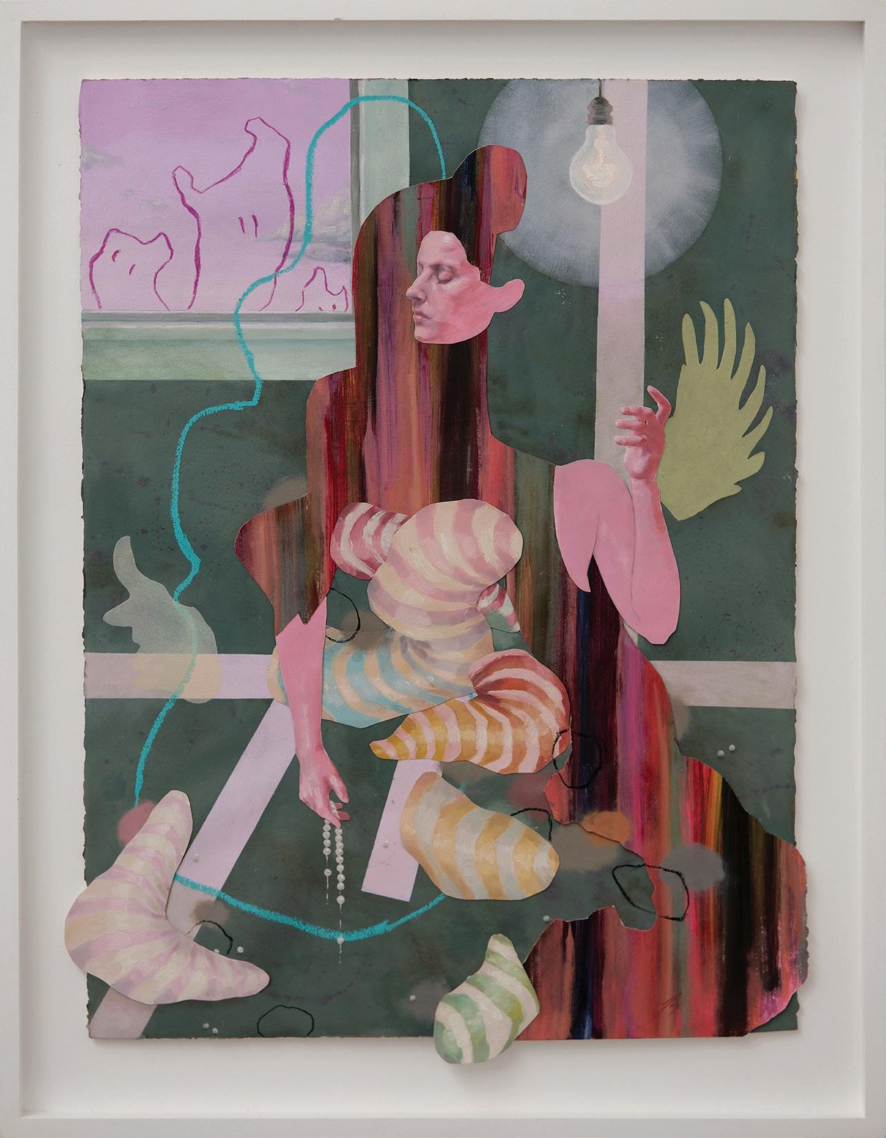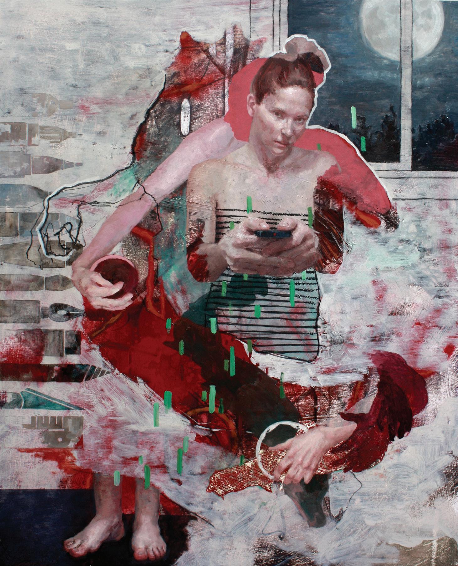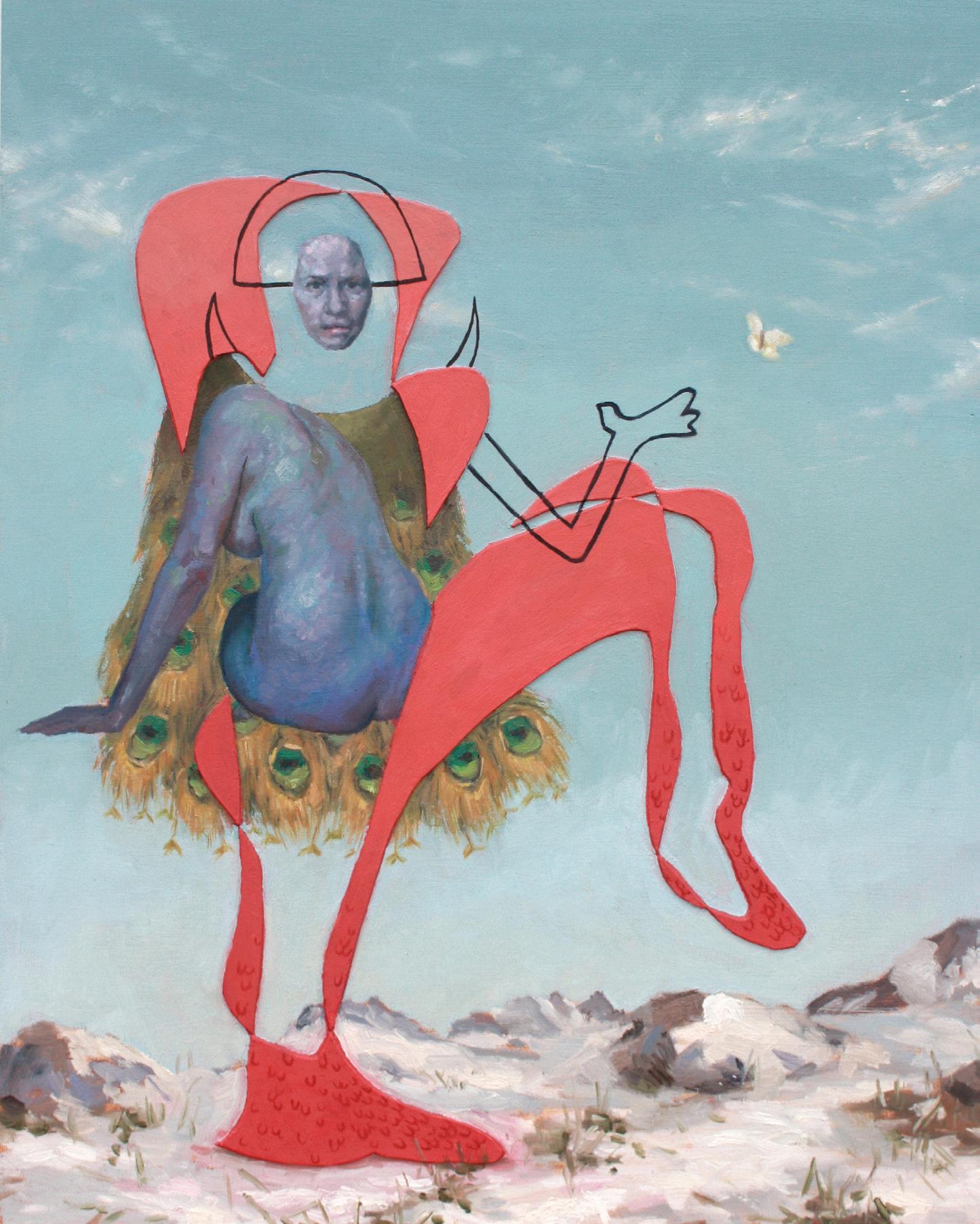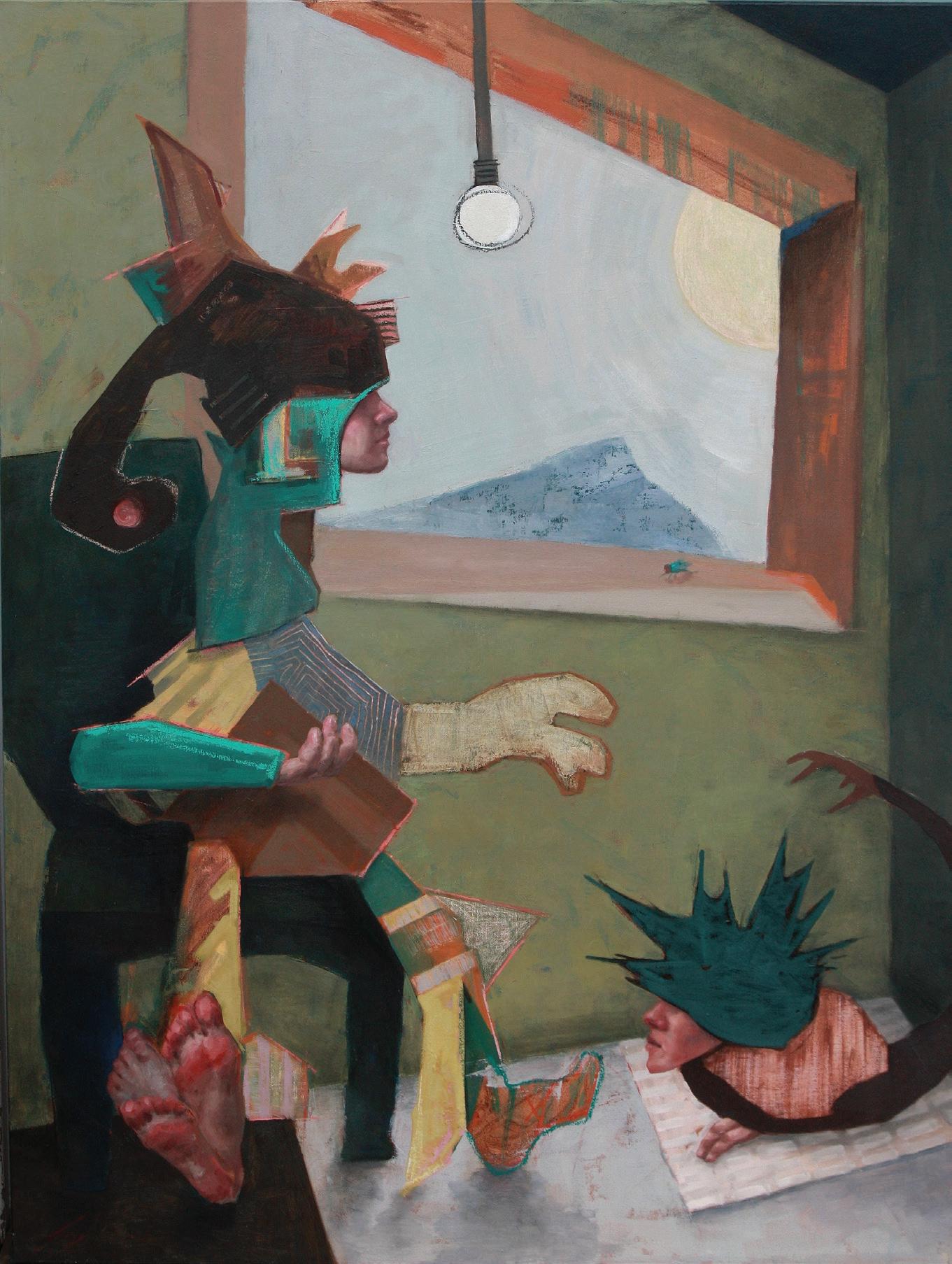 Conversation (with help from Kiyotada and Cezanne) (pg. 66) is also a collage and powerfully states the exhibition’s central theme. Here a figure inspired by the 18th century Japanese artist Kiyotada, sits on a chair in a room with a lightbulb, approached by a Bosch-like hybrid creature, half human, half marine animal. Outside the window/portal, Mont Saint-Victoire, made famous by 19th century French artist Paul Cezanne’s many paintings of it and now a mecca for artists and non-artists alike, is almost reachable…if only. The larger oil painting on canvas, based on this collage, leaves more to the imagination: the figure on the chair and the strange creature on the floor continue to gesture toward each other, trapped in an interior lit by artificial light while outside the sun, mountain and blue-sky contrast with the claustrophobic interior. The tension is heightened with the introduction of a small iridescent fly on the window ledge: will it opt for freedom or join the other two in their attempt to have a conversation that spans cultures, geographies and species?
