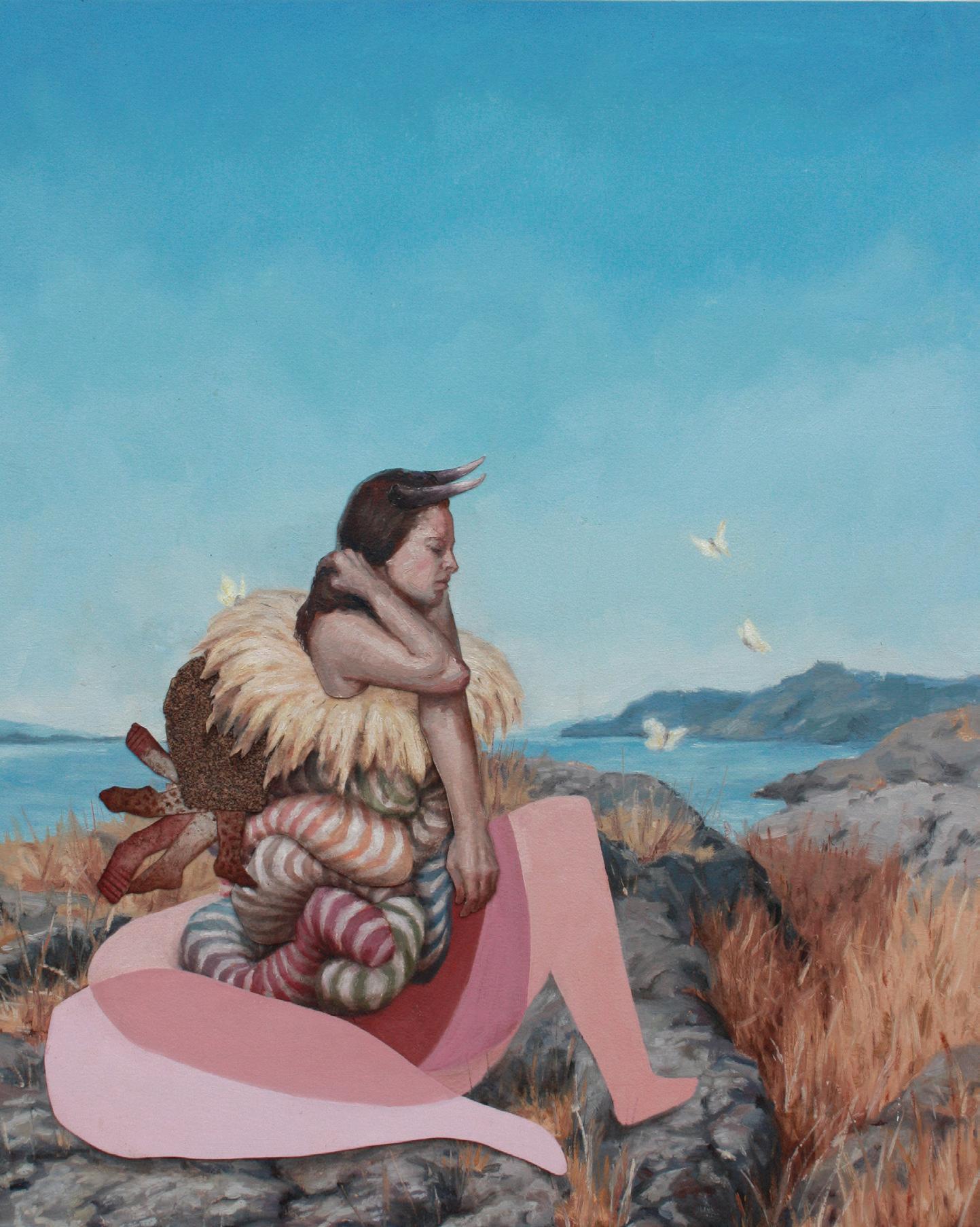 Creature by Ocean, 2022. Collaged oil painting with sandpaper, mounted on board. 12x16 in.