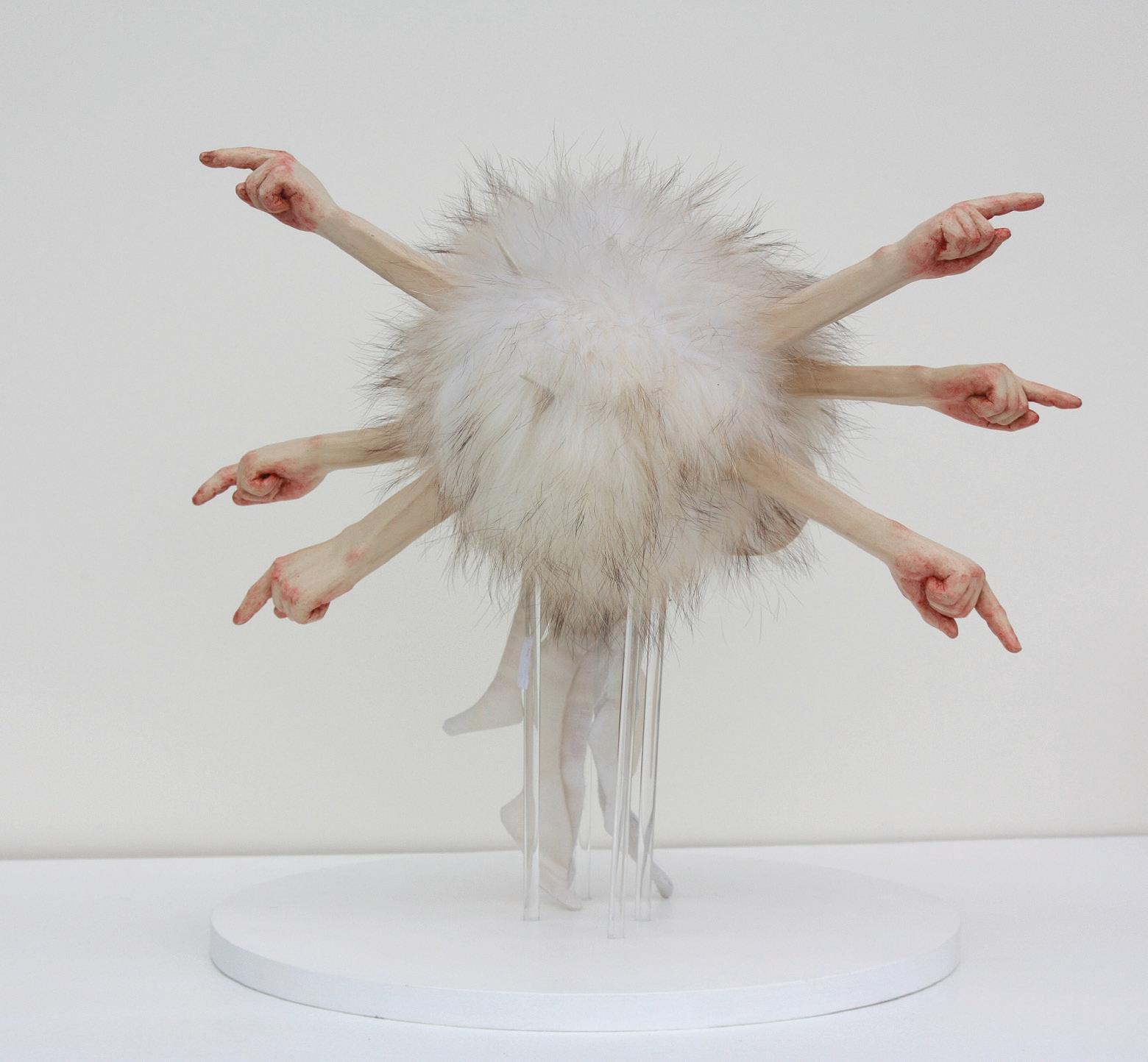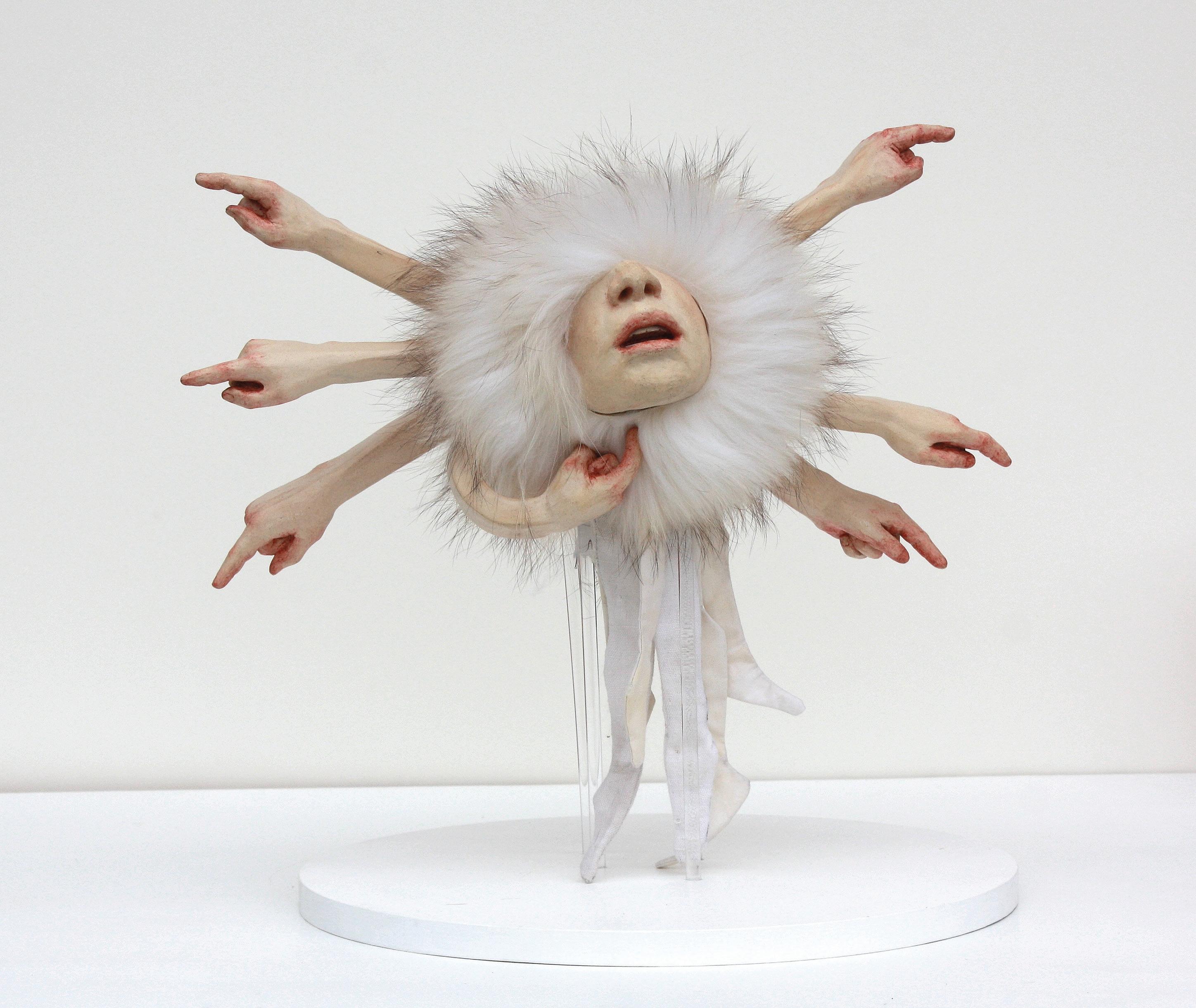 Blame Mosquito is marked by ambiguity and tension. The Medusa-like head features six arms with ruddy hands pointing fingers away from the figure and a seventh hand, also red, pointing at its haloed fur-clad head. There is no supporting body underneath and a painting of a lunar landscape behind it. In some cultures, the mosquito is seen as a symbol of resilience, the pesky David taking on Goliath; however, in many parts of the world it is feared as a carrier of disease. The work invites viewers to interpret trauma and blame in open-ended ways.