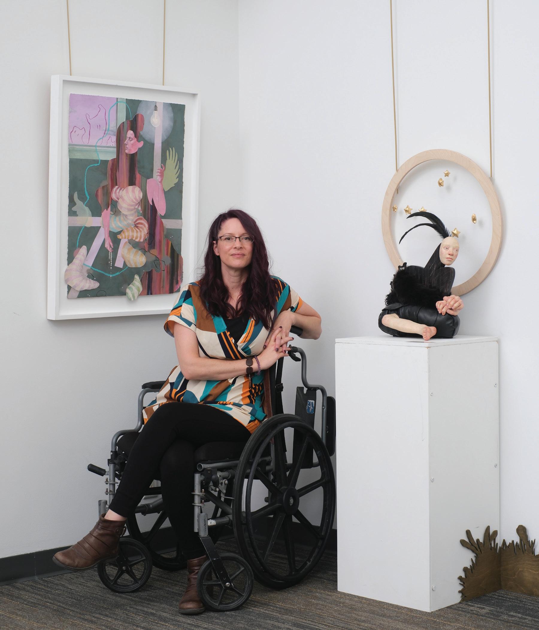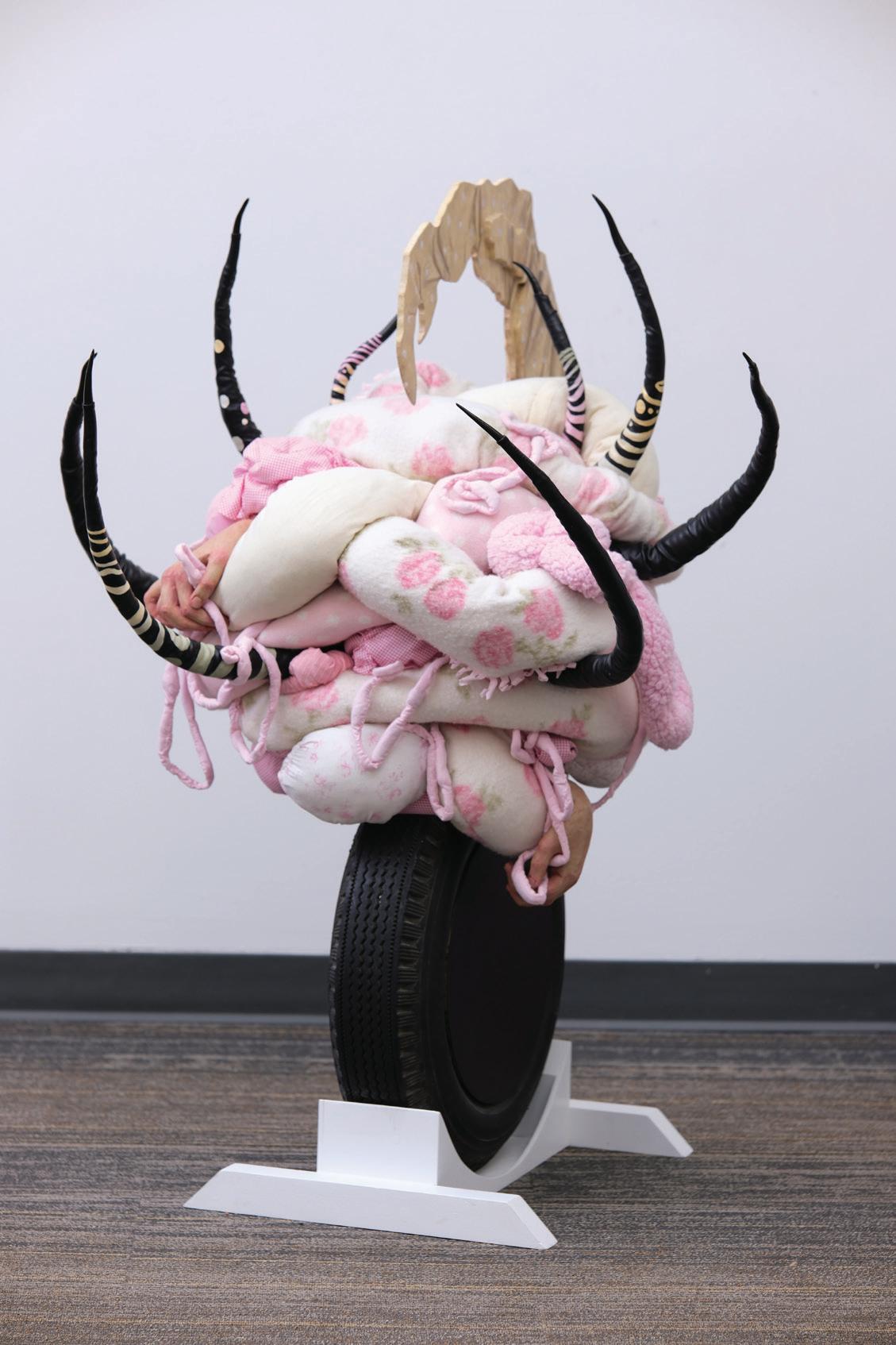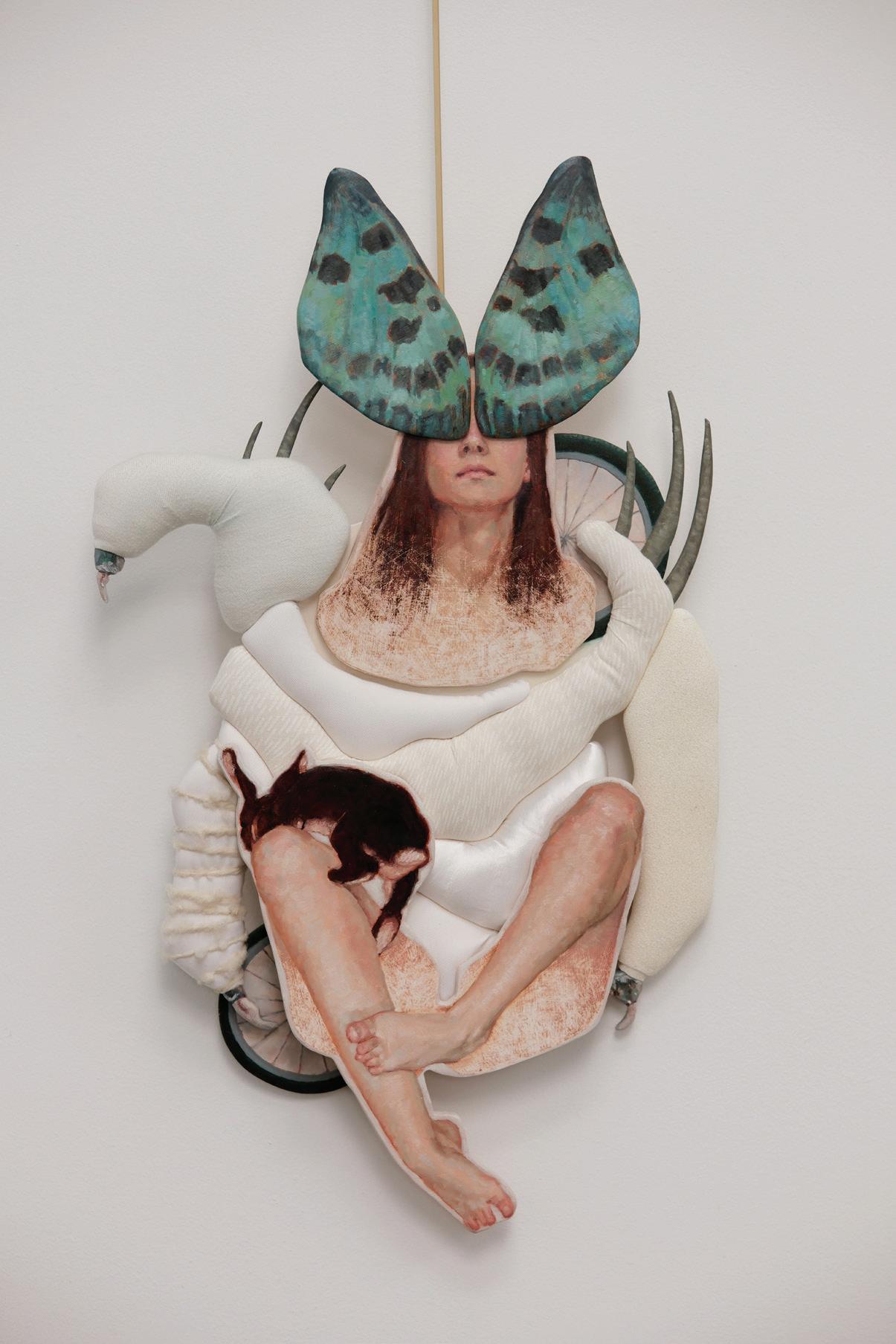 Frida Kahlo inevitably echoes here – another artist who transformed confinement into production, bed into site of resistance, body into primary subject. Yet Dyck’s creatures depart from direct selfportraiture into hybridization. Legs merge with wheels. Hair morphs into feathers. Torsos splice