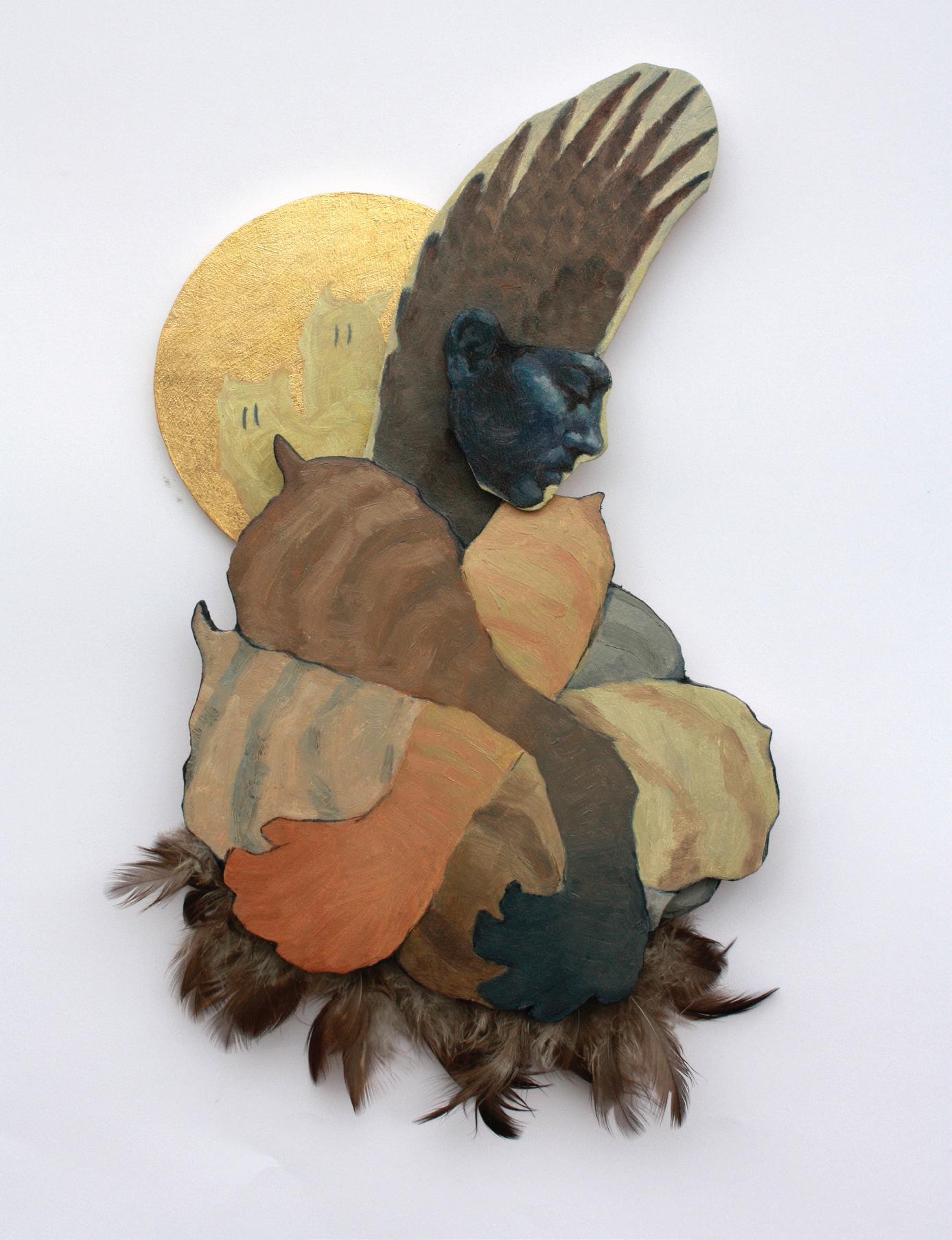 Hawk with Gold, 2022. Oil on baltic birch plywood with hawk feathers and metal leaf. 10x17.5 in.