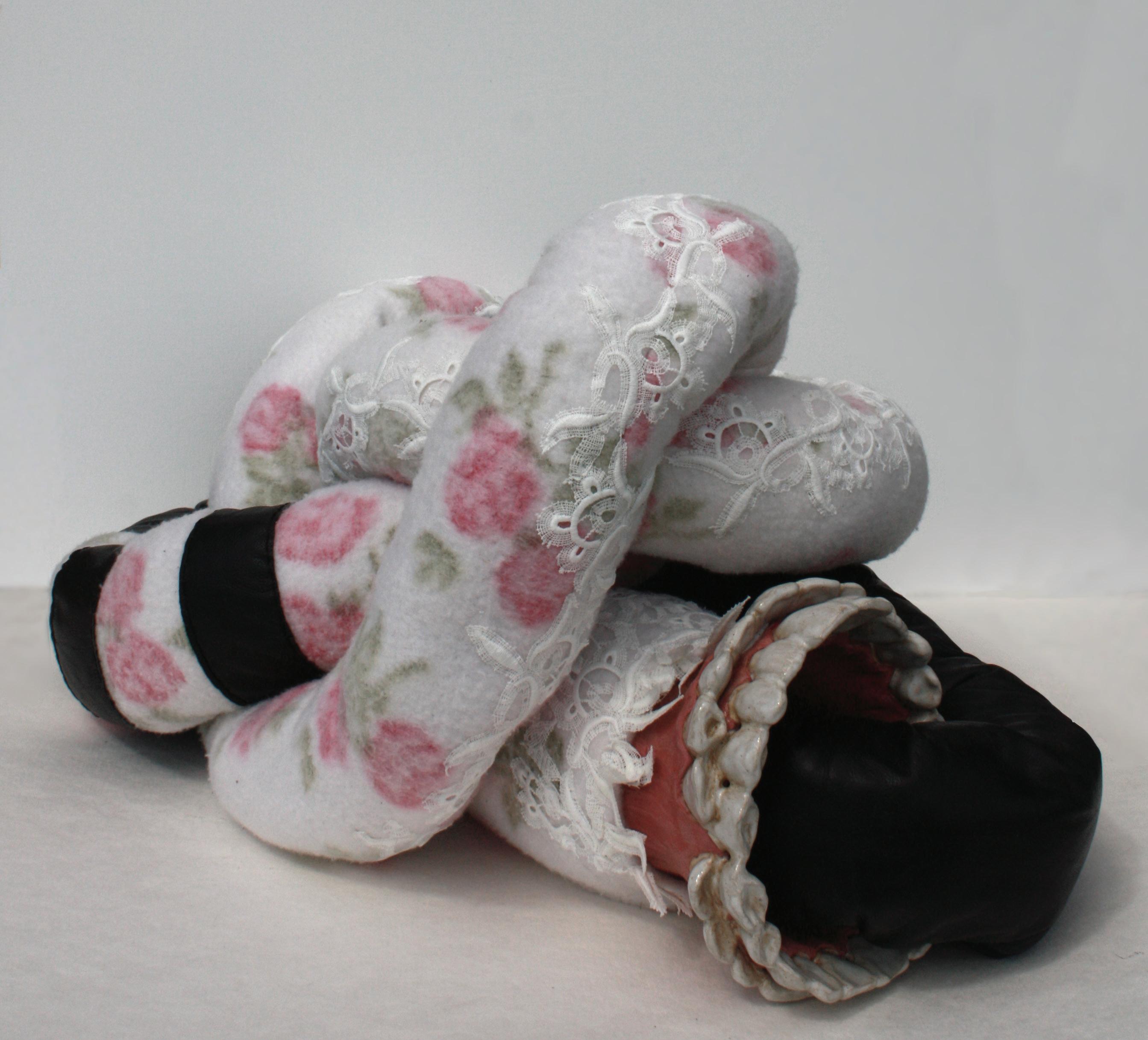 Worm with Teeth (Ouroboros), 2023. Ceramics and oil paint with reclaimed leather and fabrics. 24x16x14 in.