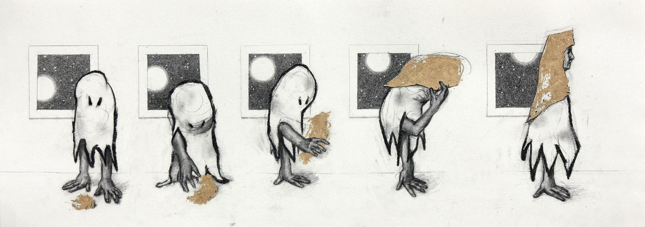 Discovering the Wise One, 2024. Charcoal and 23 ct gold leaf on paper. 11x30 in.