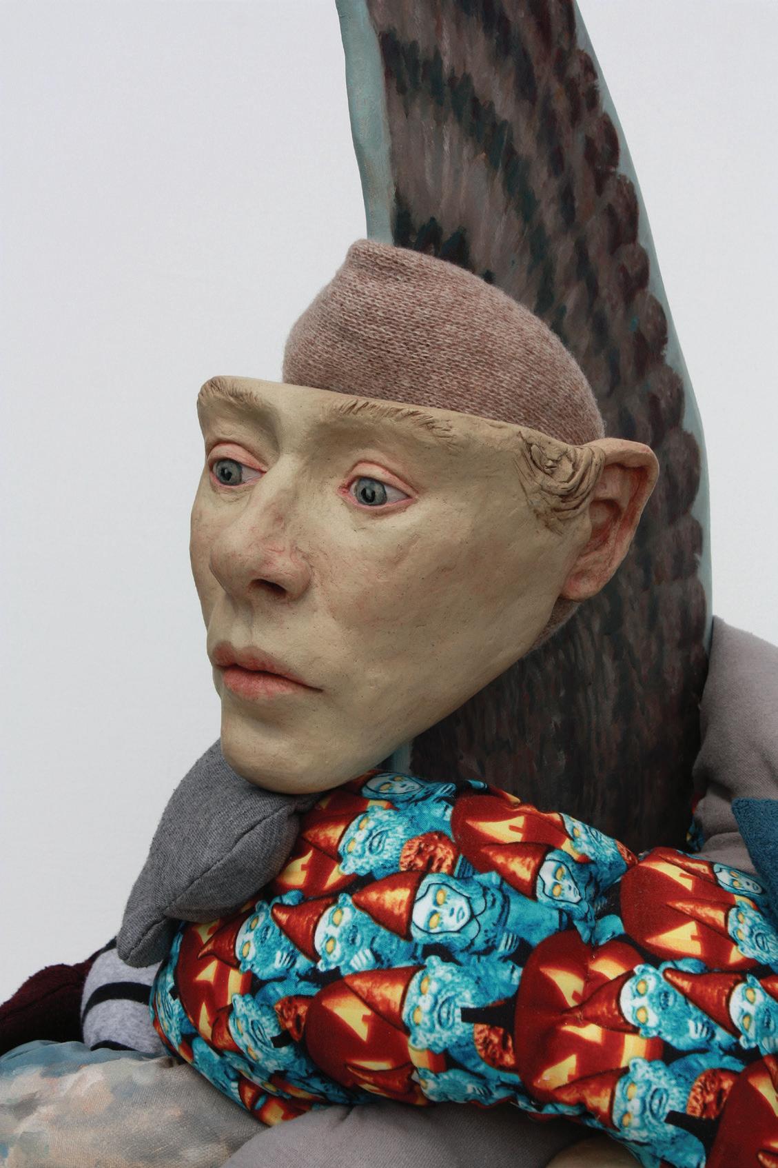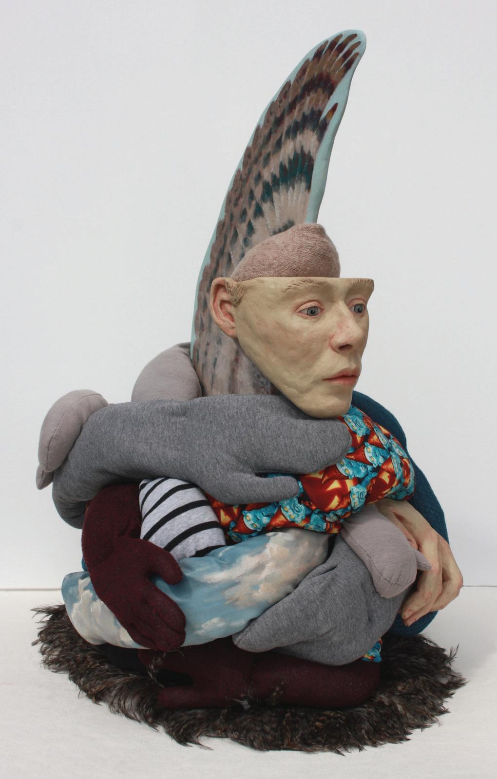 Wing Head, 2024. Ceramics, reclaimed fabrics, feather duster, oil paint on canvas and wood. 26x19x15 in.