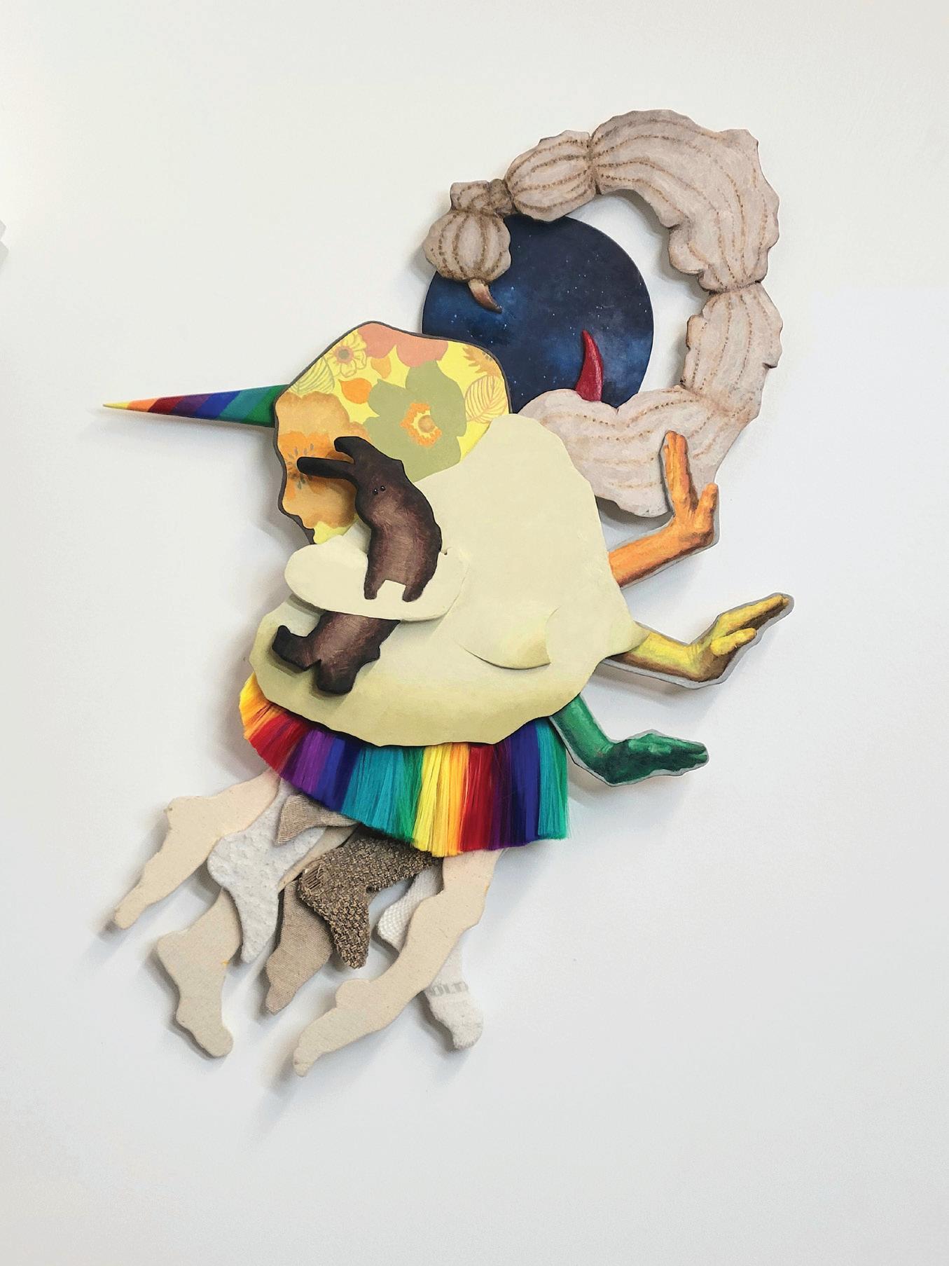 Rainbow Unicorn, 2023. Oil paint on wood with hair extensions and reclaimed fabric. 20x28.5x1 in.