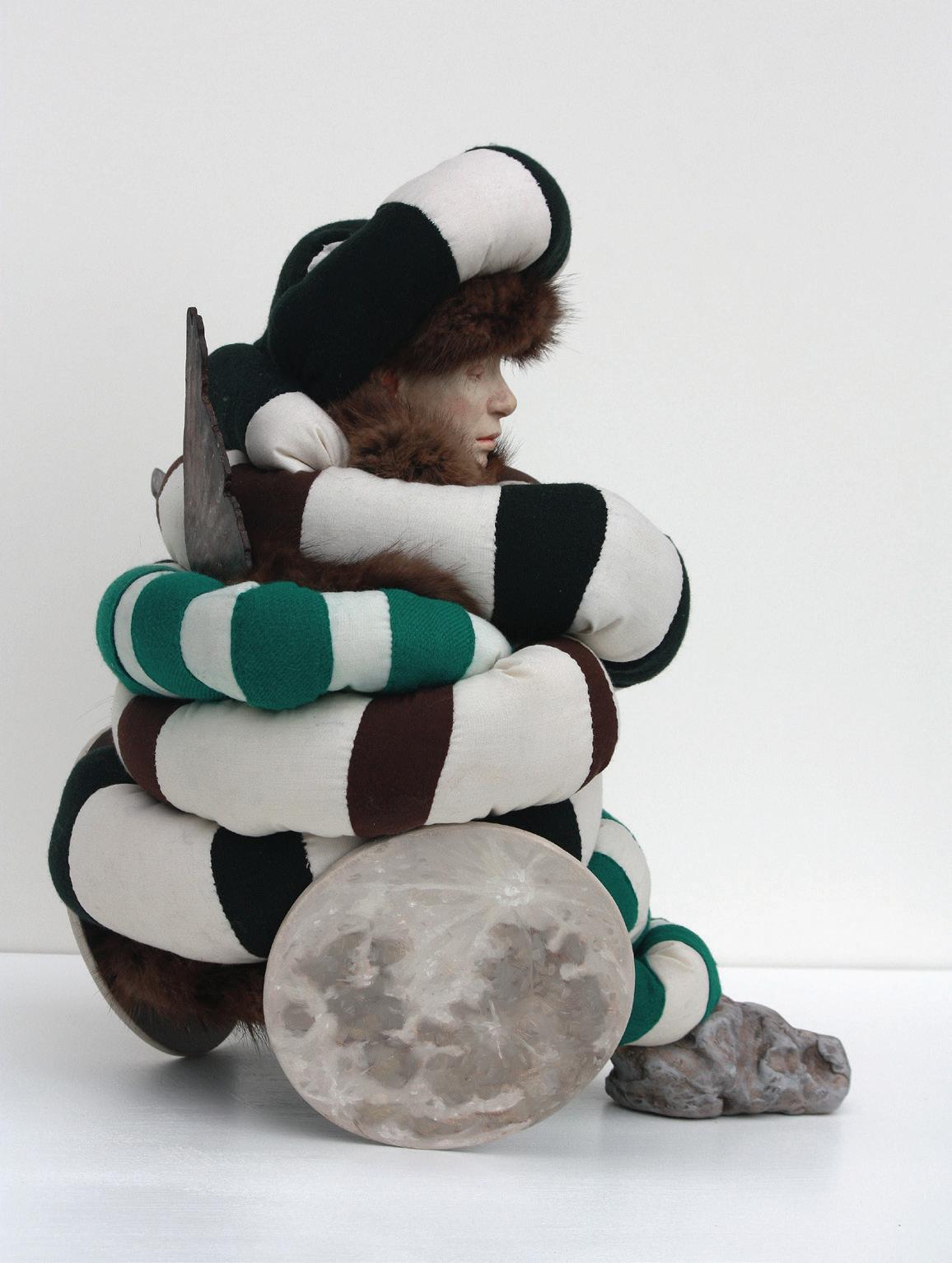 with wood grain and painted stripes. Ceramic heads and hands attached to plush textile bodies. These “Frankensteined” figures are not grotesque for spectacle’s sake; they are adaptive. They rebuild themselves from available parts.