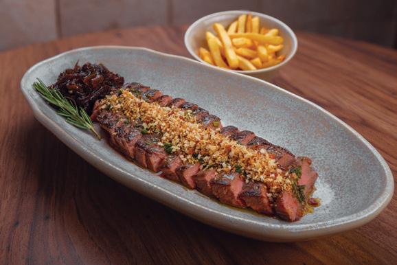 Postas assadas na brasa, azeite, alho, cebola, cheiro-verde, azeitonas portuguesas e pimentão – esse é o bacalhau à lagareiro, que acompanha batatas bolinhas e é o carro-chefe do restaurante português.