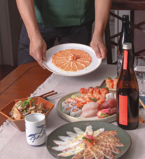 Para harmonizar com os rótulos do empório, o bacalhau à portuguesa pode ser servido com uma taça de vinho verde ou tinto.