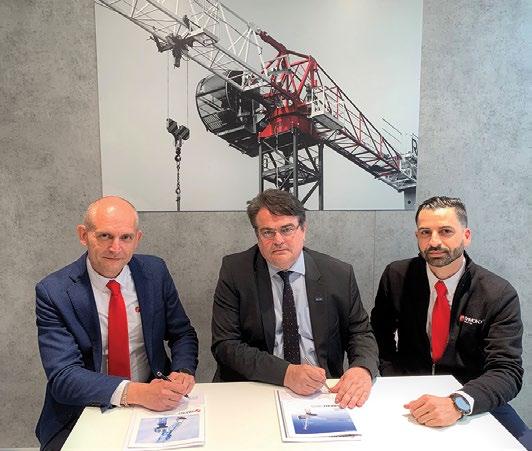 Buying all the three cranes on the Raimondi stand at Bauma 2019 (L-R) Mauro Masetti of Raimondi, Edward Seager and Cristian Badin