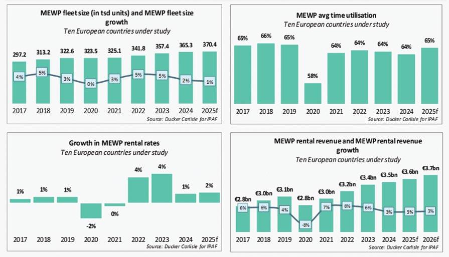 The reports estimate the size of the worldwide aerial work platform rental fleet while also estimating rental revenues and rates, fleet size, utilisation levels, fleet mix, machine power sources, investment and annual retention period. The analysis covers Europe, the United States and Asia. For more details on the report see IPAF page 65.