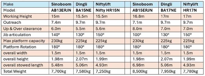 Both machines are 1.5 metres wide and have a stowed height of just less than two metres, while the AB13 is 5.4 metres long in stowed transport mode, while the AB15 is 5.82 metres long. Total weight is 7,700kg and 8,500kg respectively.