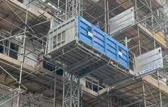 MC 250 material hoist installed in a tube & fitting scaffold, along with the new PT 650 transport platform and a PMH passenger and goods hoist.