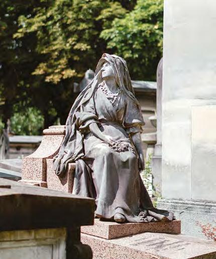 We located Morrison first. We knew we were drawing near as we spotted graffiti tributes scratched into surrounding graves, with etched arrows pointing us to the ‘Lizard King’. His grave was littered with offerings like fresh-cut flowers, hand-written letters, CDs and cigarettes. Small tombs lined cobbled paths, some with stained glass depicting saints or family emblems. It felt extremely Edward Gorey, with strange sculptures, uneven stone stairways, and intricate memento mori art.