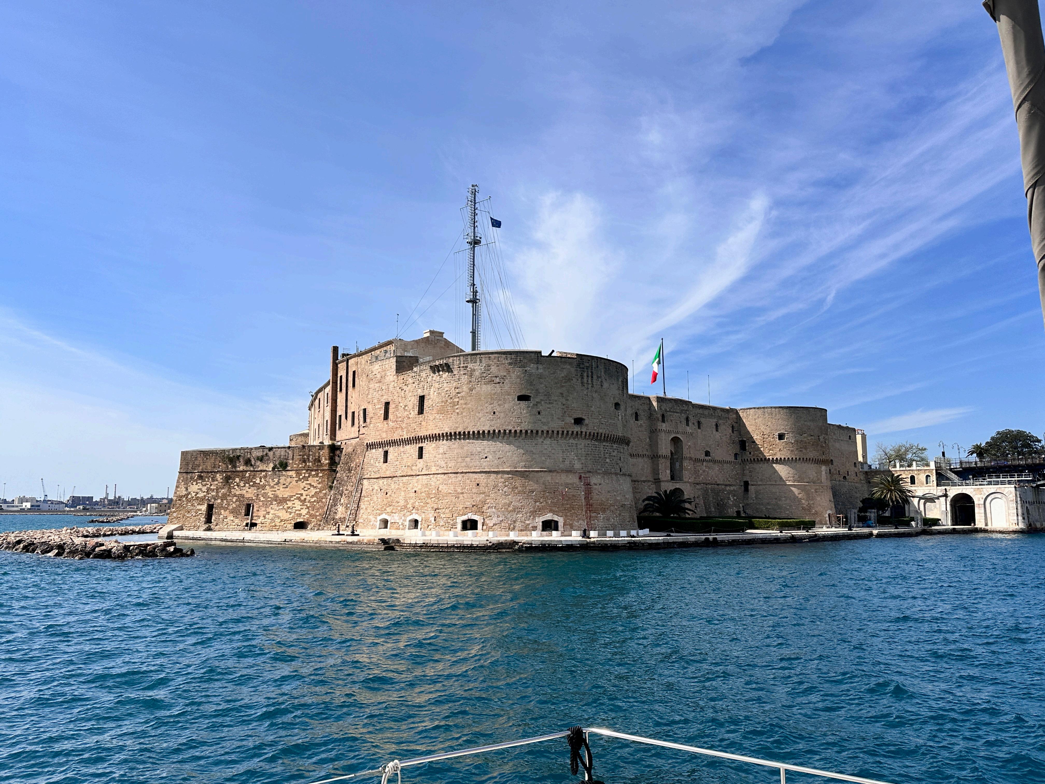 Sailing past this iconic 15th-century fortress during a catamaran lunch on the Gulf of Taranto history, sea, and sunlight blending into a perfect Apulian afternoon