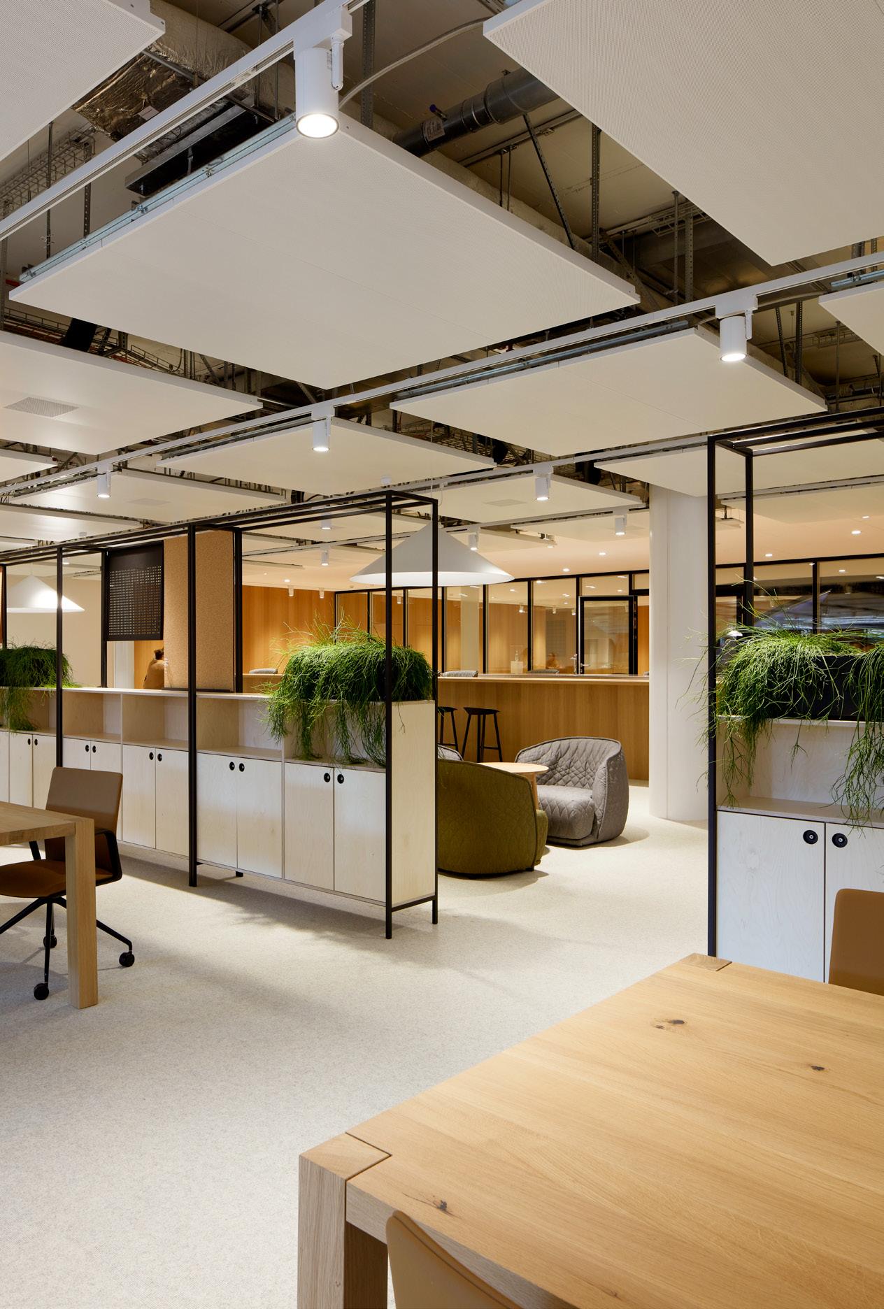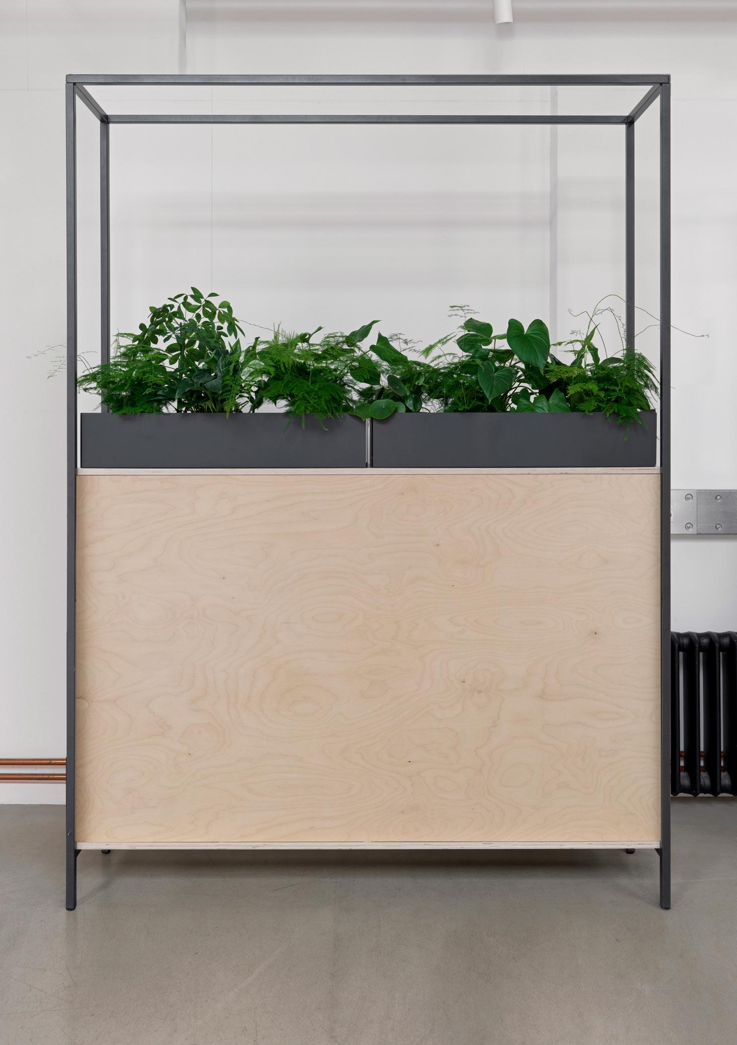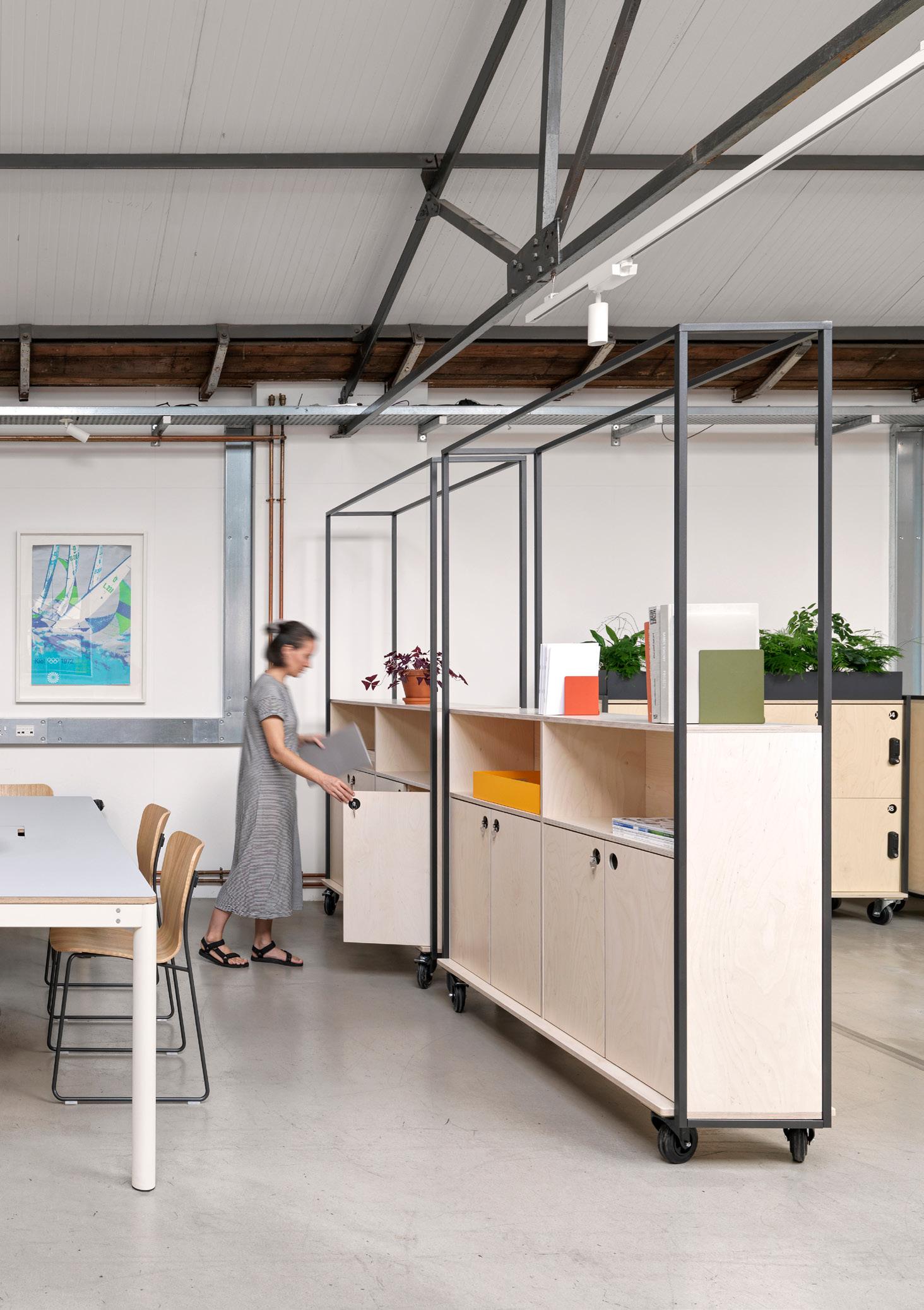 The High Studio Storage runs parallel within the open plan design, offering clutter free storage away from desking, without the need for fixed joinery. With this future-proof approach the Studio Storage can easily be reconfigured to change the layout. Our Planters were included to further define the space.