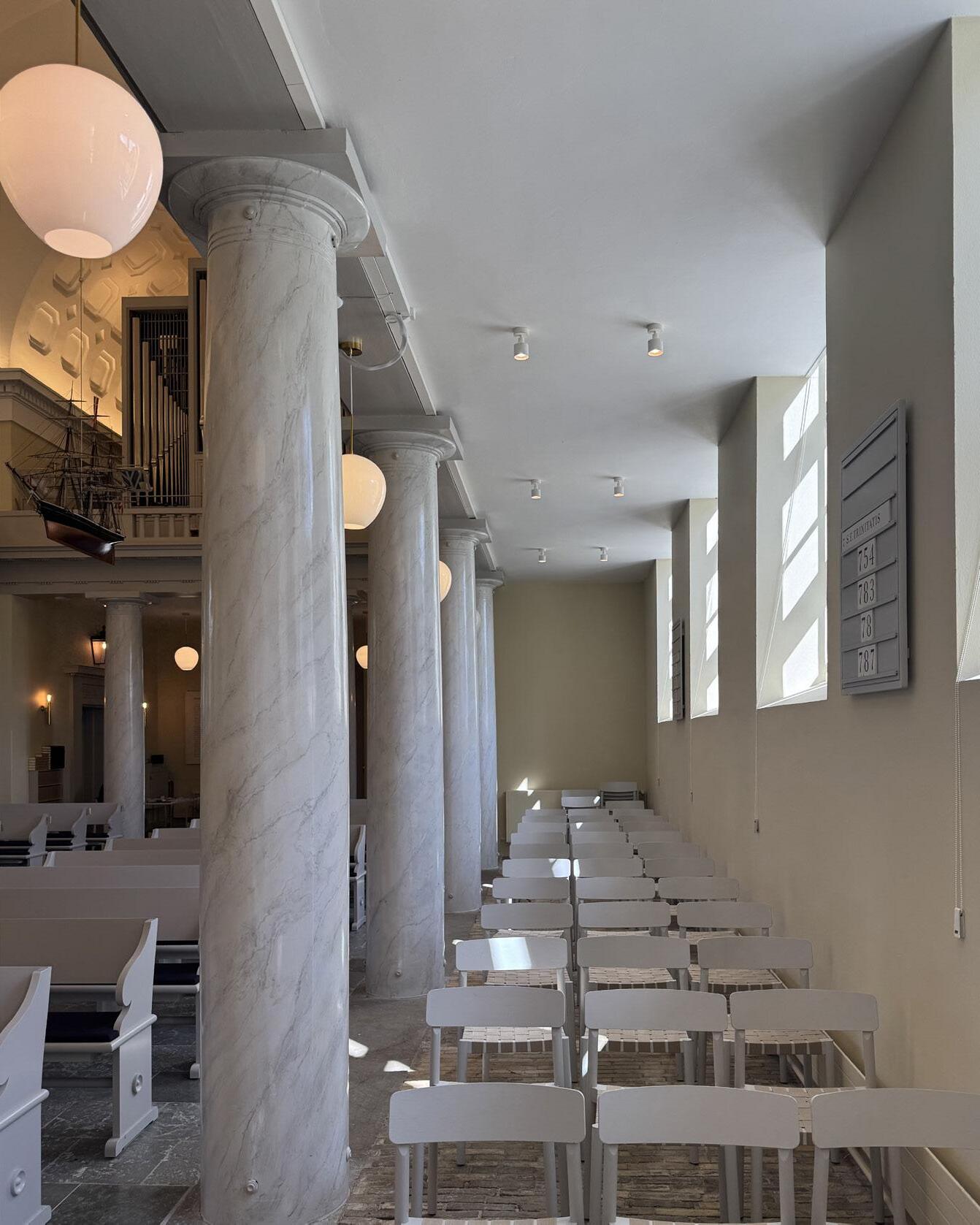 Kirkens nye gulv danner et stofligt modspil til de kalkede hvide mure og tilfører rummet en rolig tyngde. Sideskibene er blevet frigjort for faste bænke og møbleret med Kaare Klints ikoniske kirkestol i en dyb blå nuance – genbrugte og nyistandsatte, så stolene både rummer historie og nutidig funktionalitet.