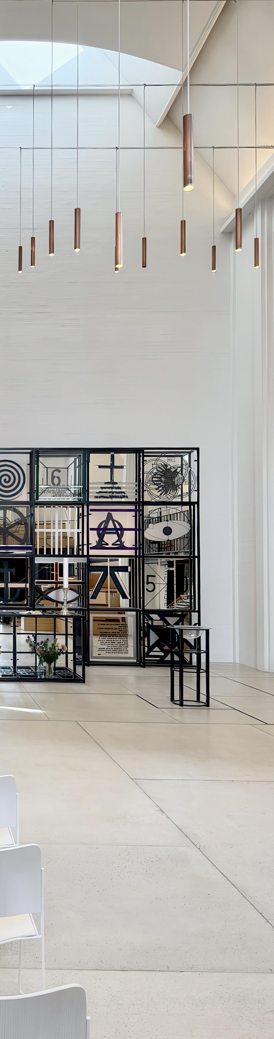 Altertavlen, udført i samarbejde med billedkunstner Margrethe Sørensen, er en 7 x 4 meter stor jernstruktur fyldt med symbolik og rytmiske felter, der kalder på refleksion. Belysningen har været afgørende i transformationen. Lys og arkitektur arbejder her som ligeværdige partnere i at forme stemningen og rummet.