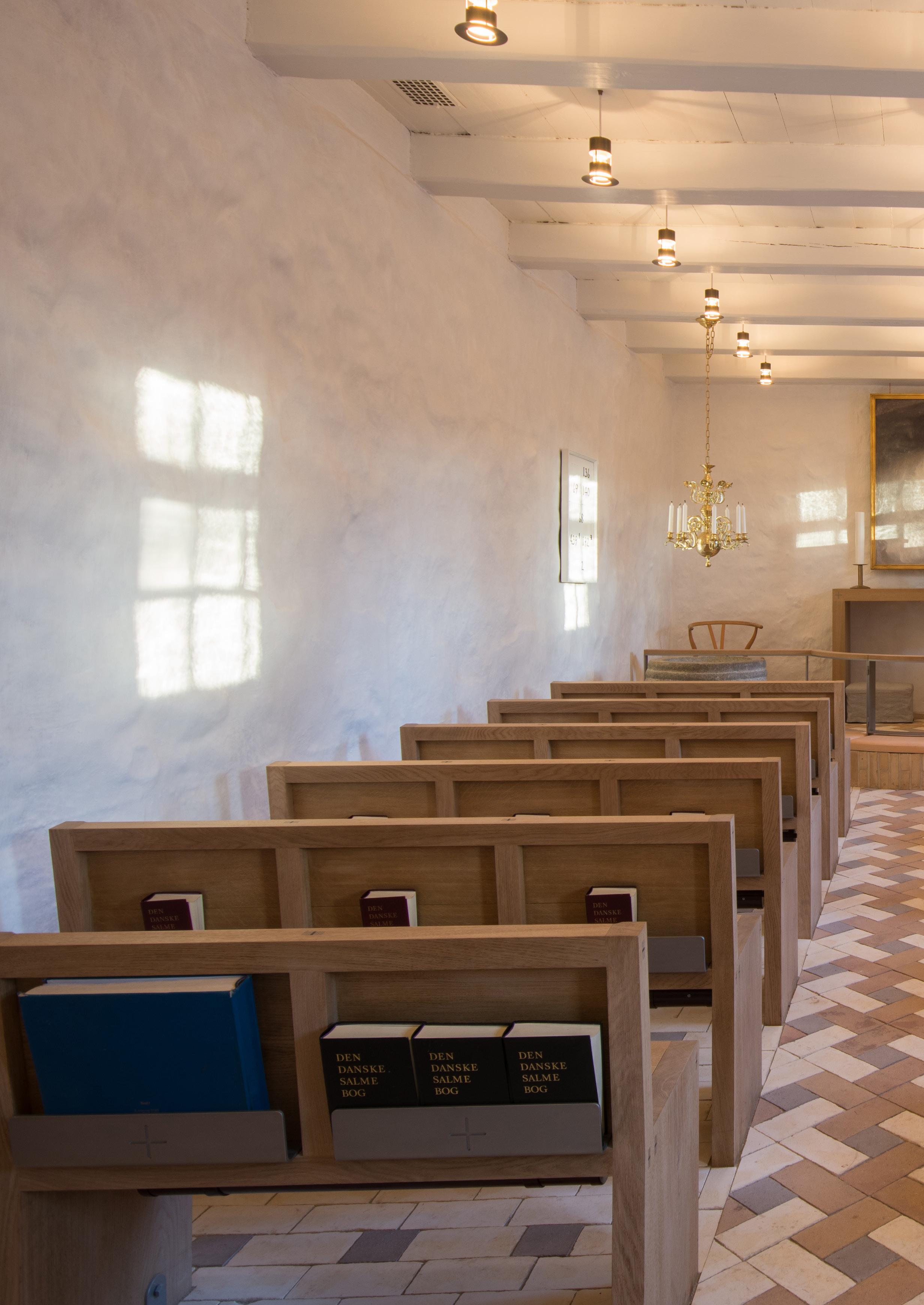 Alt inventar er nytegnet til kirken og fremstillet med fokus på traditionelle håndværksteknikker – udført af lokale håndværkere. Det nye gulv udjævner tidligere niveauforskelle og skaber en glidende og værdig adgang gennem kirkerummet.