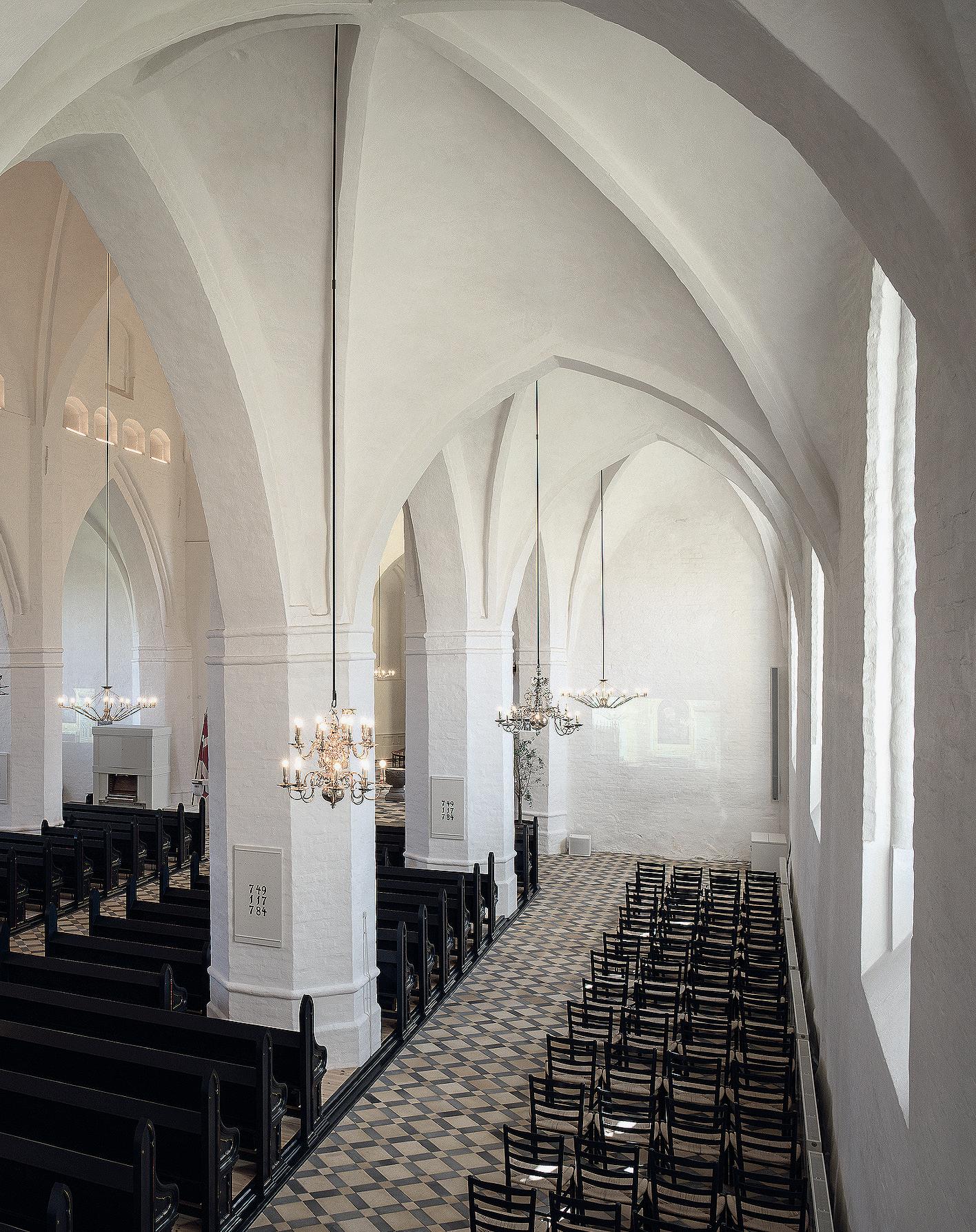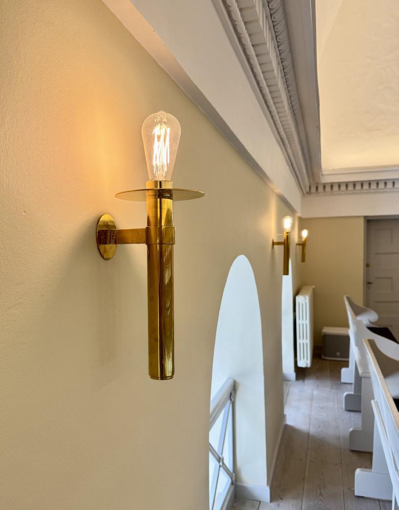 Sideskibene belyses af diskrete, hvide Dybbøl loftversion, mens pulpituret, hovedindgangen og trappegangene er udstyret med specialdesignede væglamper i messing fra Okholm Lighting – inspireret af fakler, og skabt til at være både dekorative og funktionelle.