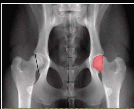 Ventrodorsal pelvic radiograph of normal coxofemoral joints (left) indicating the cranio-caudal distance of the dorsal acetabular rim (CrCdAR), the shortest distance (black line) between the craniolateral edge and the caudolateral edge of the acetabulum and (right) surface coverage of femoral head (CFH, red area). Photo credit PMC
