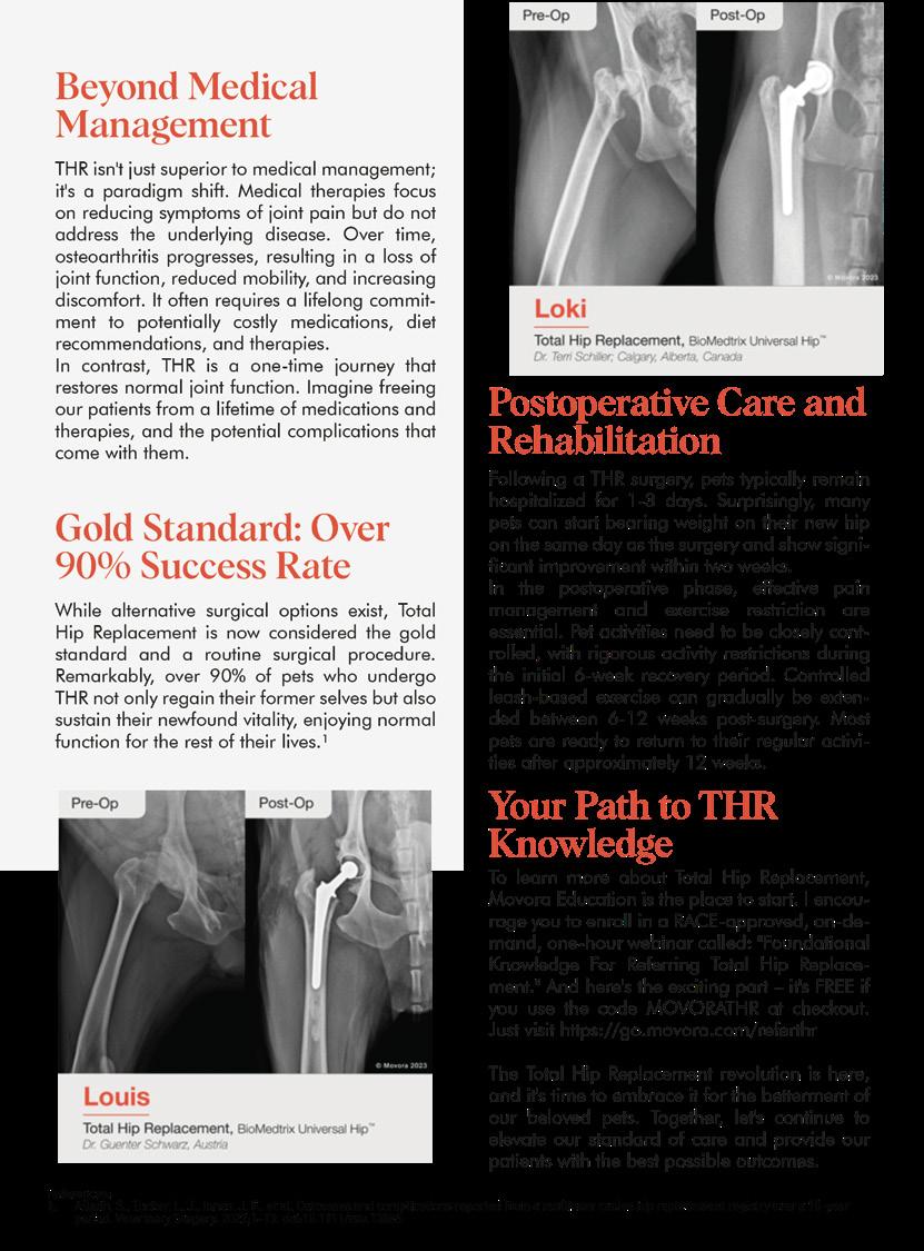 Total Hip Replacement (THR) isn’t just superior to medical management; it’s a paradigm shift. It is a one-time procedure that restores normal joint function. This translates to freeing your canine and feline patients from a lifetime of medications and therapies, and the potential complications that come with them. Our groundbreaking on-demand webinar is designed to provide the necessary information for referring dogs and cats for THR: