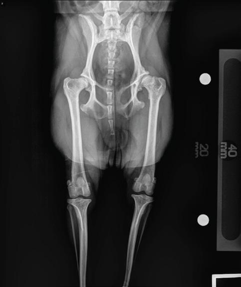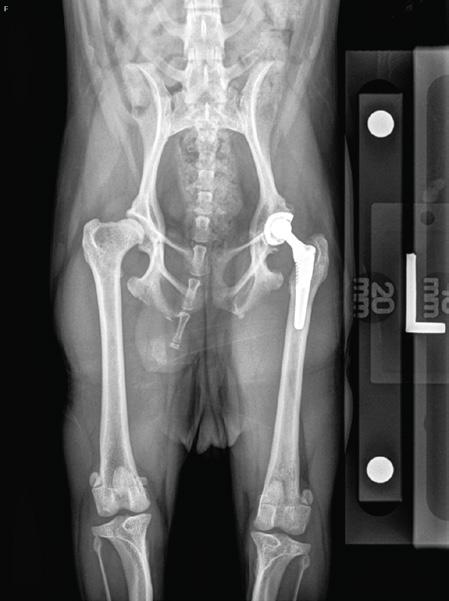 Hip dysplasia is one of the most common skeletal disorders and causes of lameness in dogs. Many companion animals suffer from debilitating hip dysplasia, leading to hip subluxation with secondary osteoarthritis (see figure 1 and photo- pre and post-operative 2-year-old 2.8kg Brussels). Other causes of hip pain may be secondary to traumatic round ligament tear, hip luxation, osteonecrosis, or femoral head or neck fracture. Avascular necrosis of the femoral head and neck (Legg-Calve-Perthes disease) and slipped femoral capital epiphysis (SFCE) are conditions more prominent in small breed dogs and cats. Maine Coons and male, neutered cats have an increased predisposition for SFCE, with up to 36-41% of affected cats having bilateral disease.¹,²