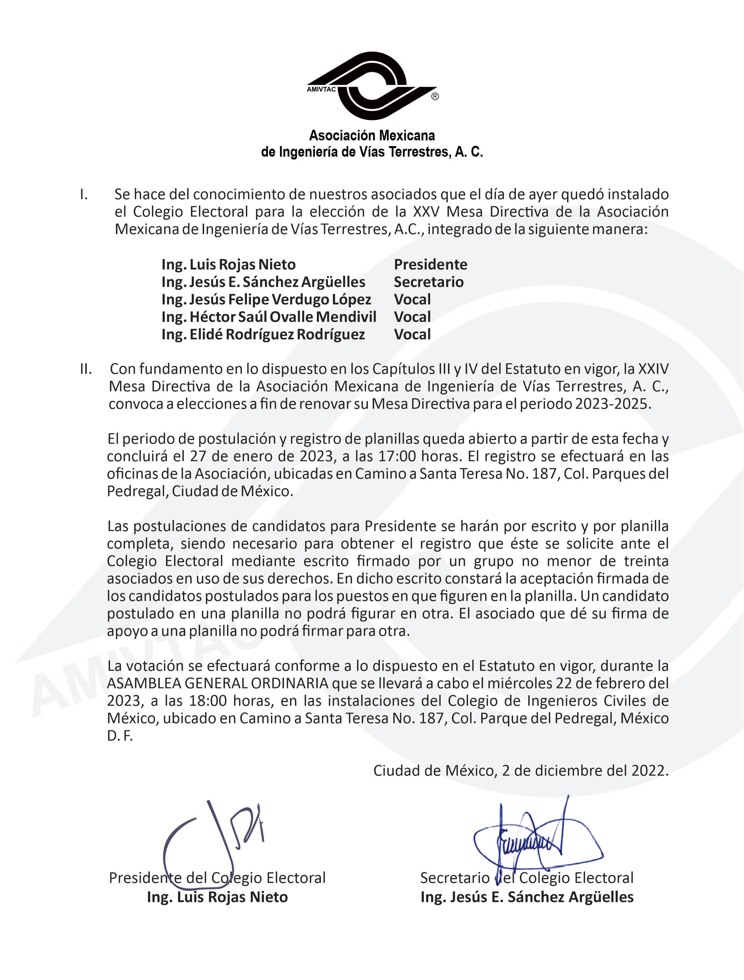 Felicito a nuestros socios por mostrar invariablemente un gran interés en asistir a los eventos técnicos de la AMIVTAC. Asimismo, les expreso mi profundo agradecimiento por el gran apoyo que nos han brindado en tales eventos, cuyo objetivo fundamental es promover y difundir el conocimiento de la ciencia en la especialidad de ingeniería de vías terrestres, así como incentivar el mejoramiento del nivel profesional de los socios de la AMIVTAC.