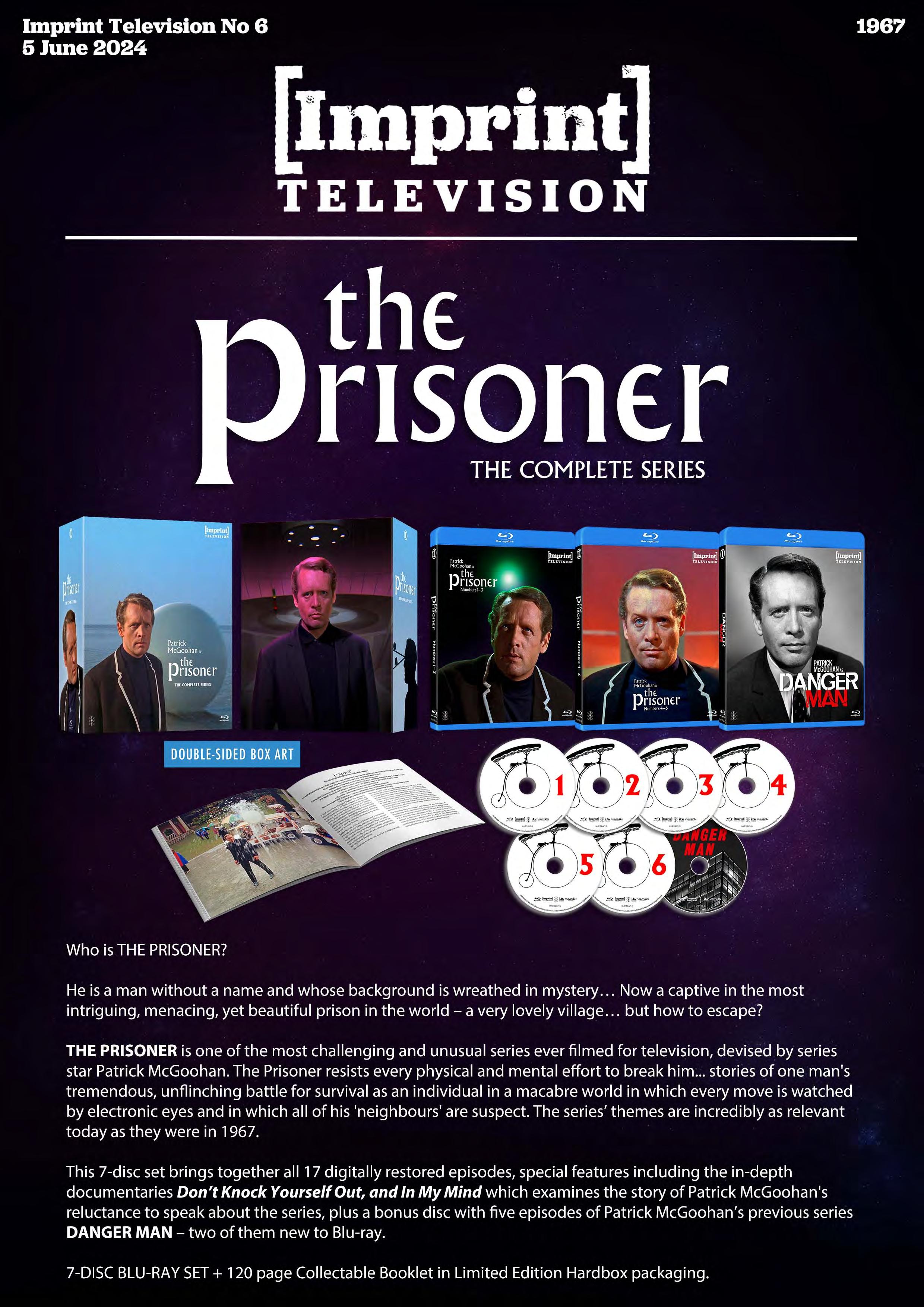This 7-disc Limited Edition Hardbox set brings together all 17 digitally restored episodes, brand NEW and archival Special Features, the in-depth documentaries ‘Don’t Knock Yourself Out’, and ‘In My Mind’ which examines the story of Patrick McGoohan's reluctance to speak about the series, PLUS a bonus disc with five episodes of Patrick McGoohan’s previous series DANGER MAN – two of them new to Blu-ray. Also included is a 120 page collectable booklet.