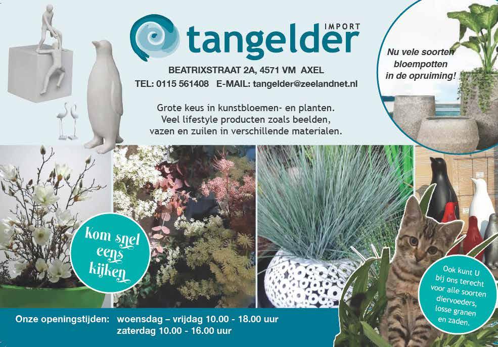 Wij leveren putzand en tuingrond en diverse andere bouwmaterialen aan bedrijven en par�culieren Tevens kunnen wij schone grond ontvangen Bel voor meer informa�e : 0115-486486 of 06-53398900 F. van den Hemel Adresgegevens: Wi�estraat 8, 4521 RB BIERVLIET “U zoekt een jong gebruikte auto?” Vakgarage van de Poel is altijd vertrouwd dichtbij! Absdaalseweg 41 • 4561 GE Hulst tel.: (0114) 31 44 85 www vdpoel.nl VAKGARAGE VAN DER POEL VOORJAARS ACTIE 15% KORTING OP AIRCOSERVICE Warmtepompen Hybride Cv-ketel Vloerverwarming Wij werken met de merken: Mitshubishi / Haier van airco Hybride cv ketels Daikin Warmtepompen Daikin Wij doen alle installatie techniek! Zonnepanelen Electrician huis installaties Zekeringkasten En heel veel meer! 06 13534718 | Info@zeeleverhuur.nl | www.zeeleverhuur.nl eeleverhuur installatietechniek