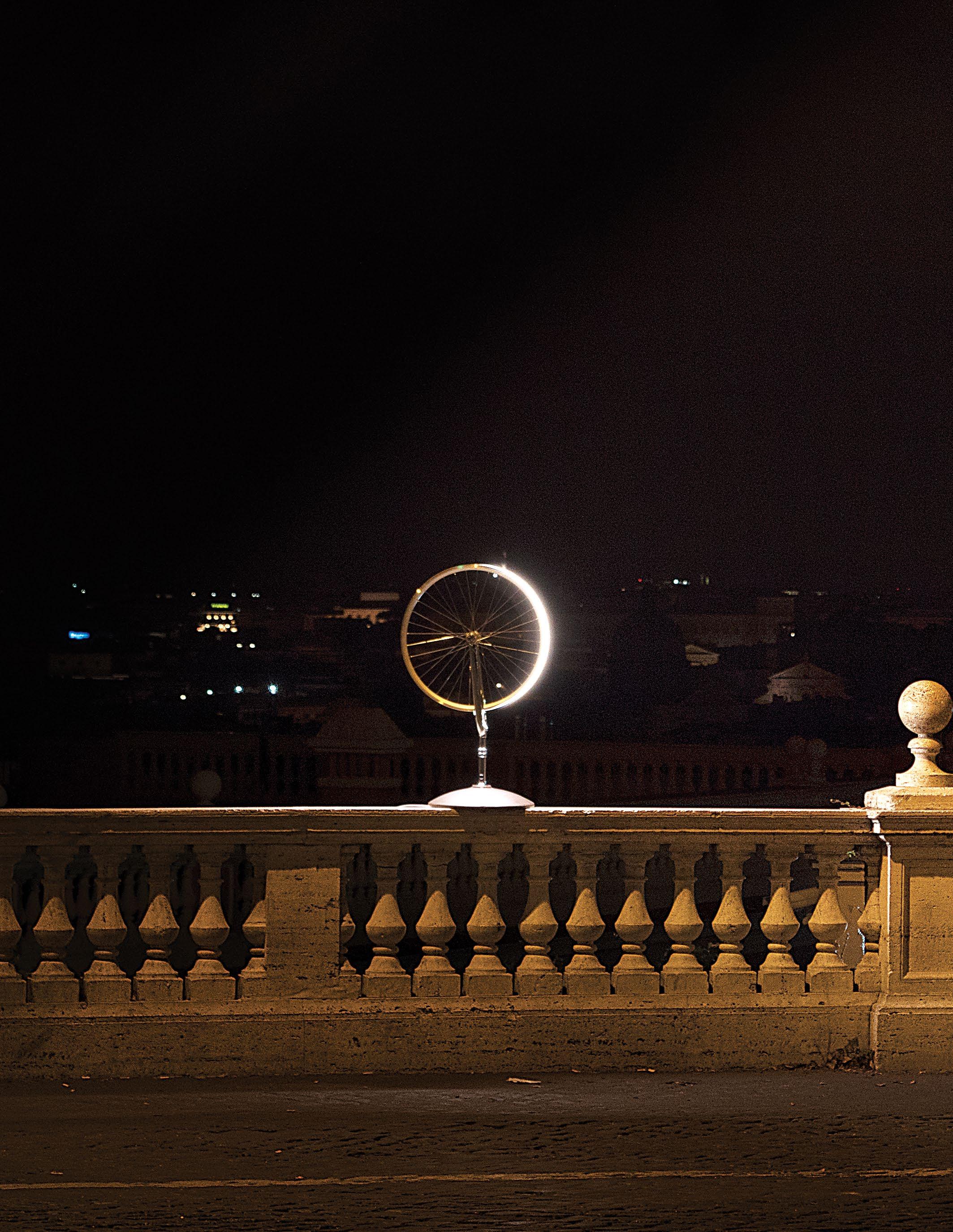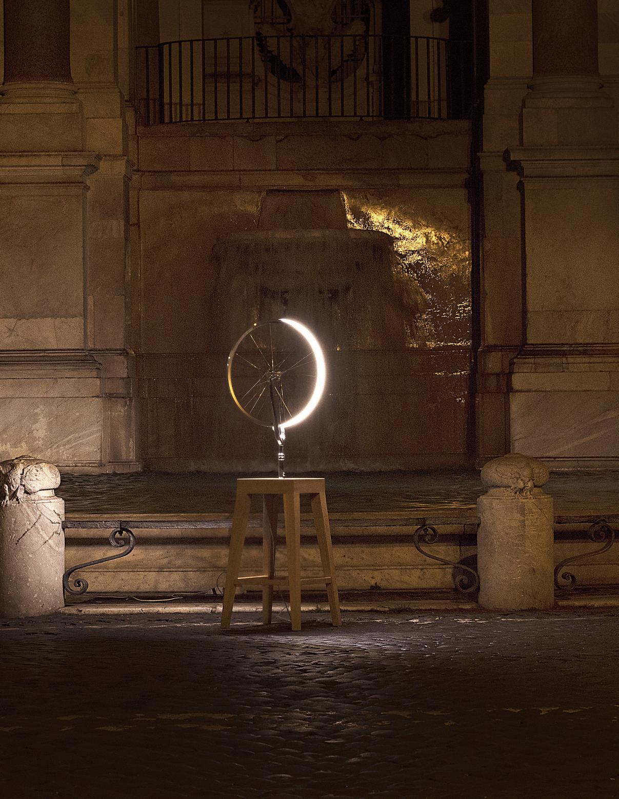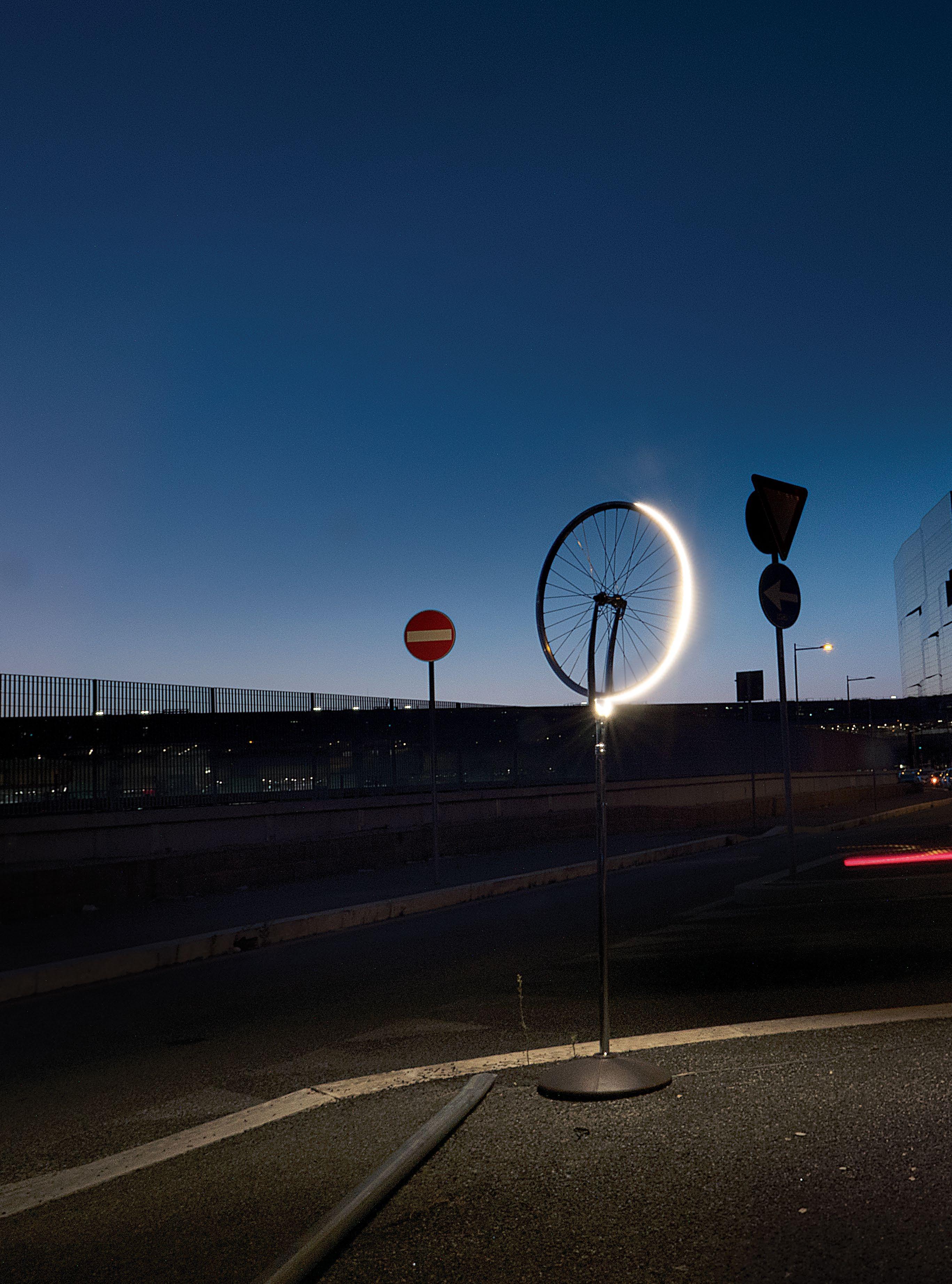 A crossover between vintage style and contemporary lighting technology, Cyclampa lamps are comprised of original, repurposed bicycle parts. Cyclampa uses the form of a familiar object as a vehicle to explore themes of activity, health, and eco-sustainability— specifically, technology’s role and increasing responsibility in connection with the environment.