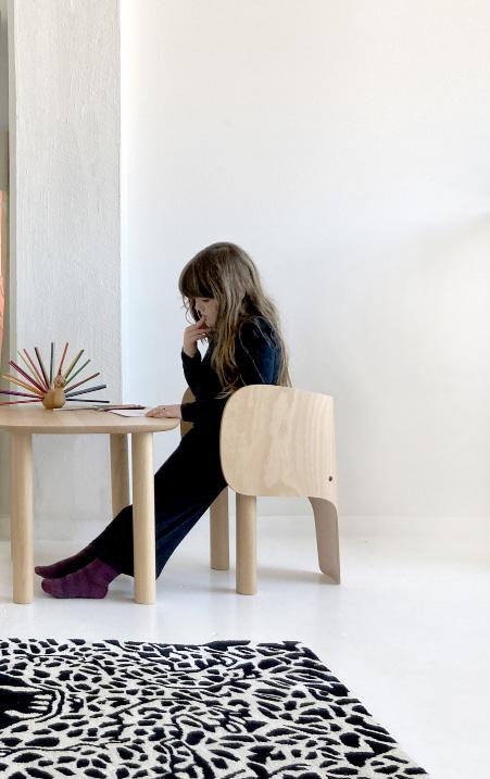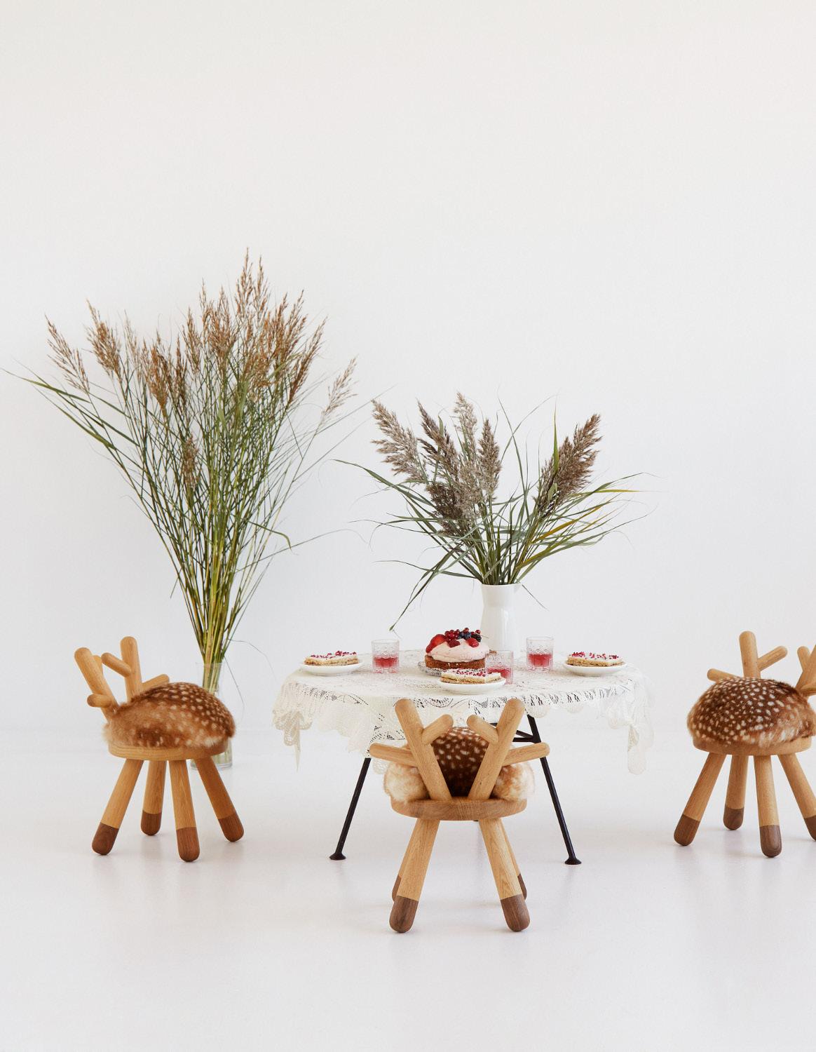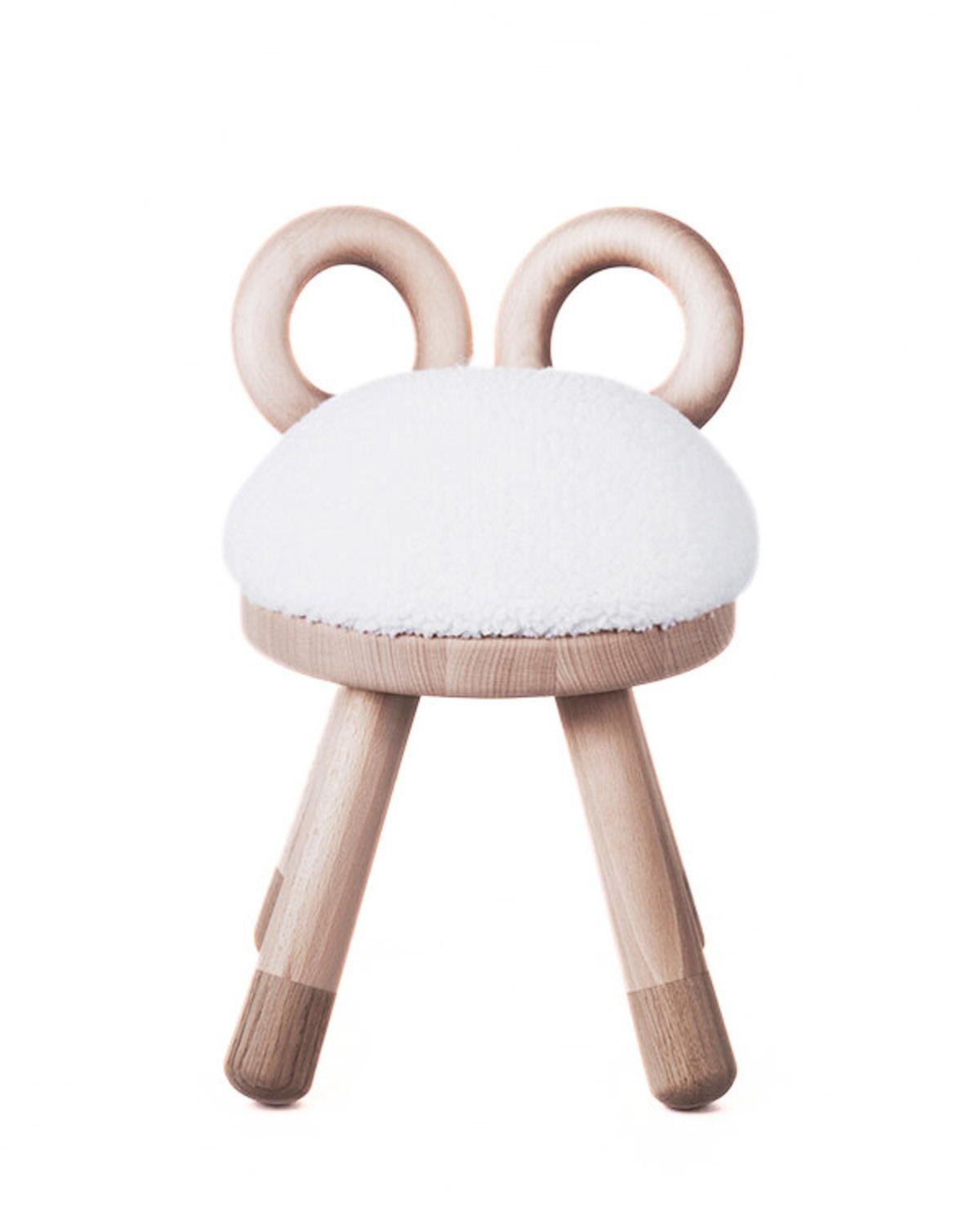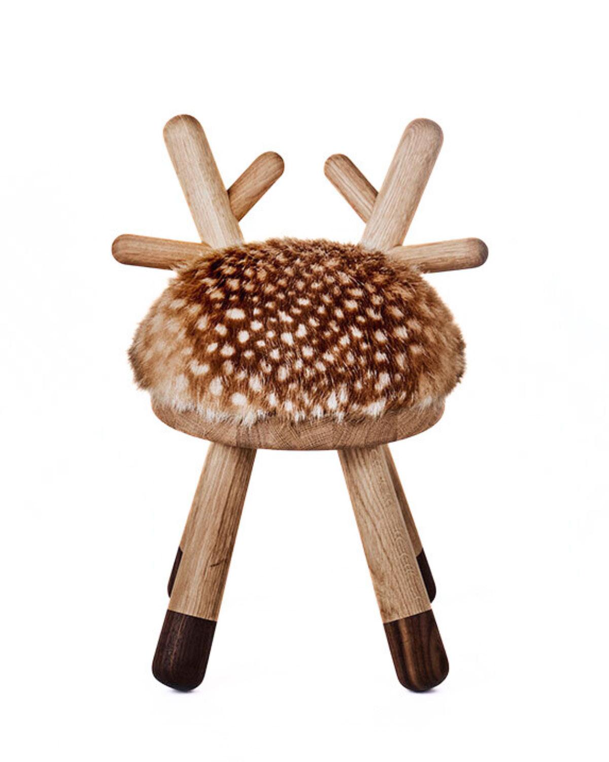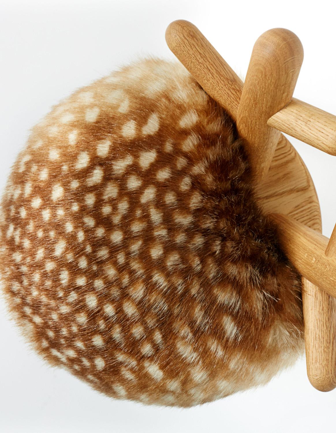 Material: Fine solid European Beech and Oak with a matte laquer finish, seat in foam and faux fur.