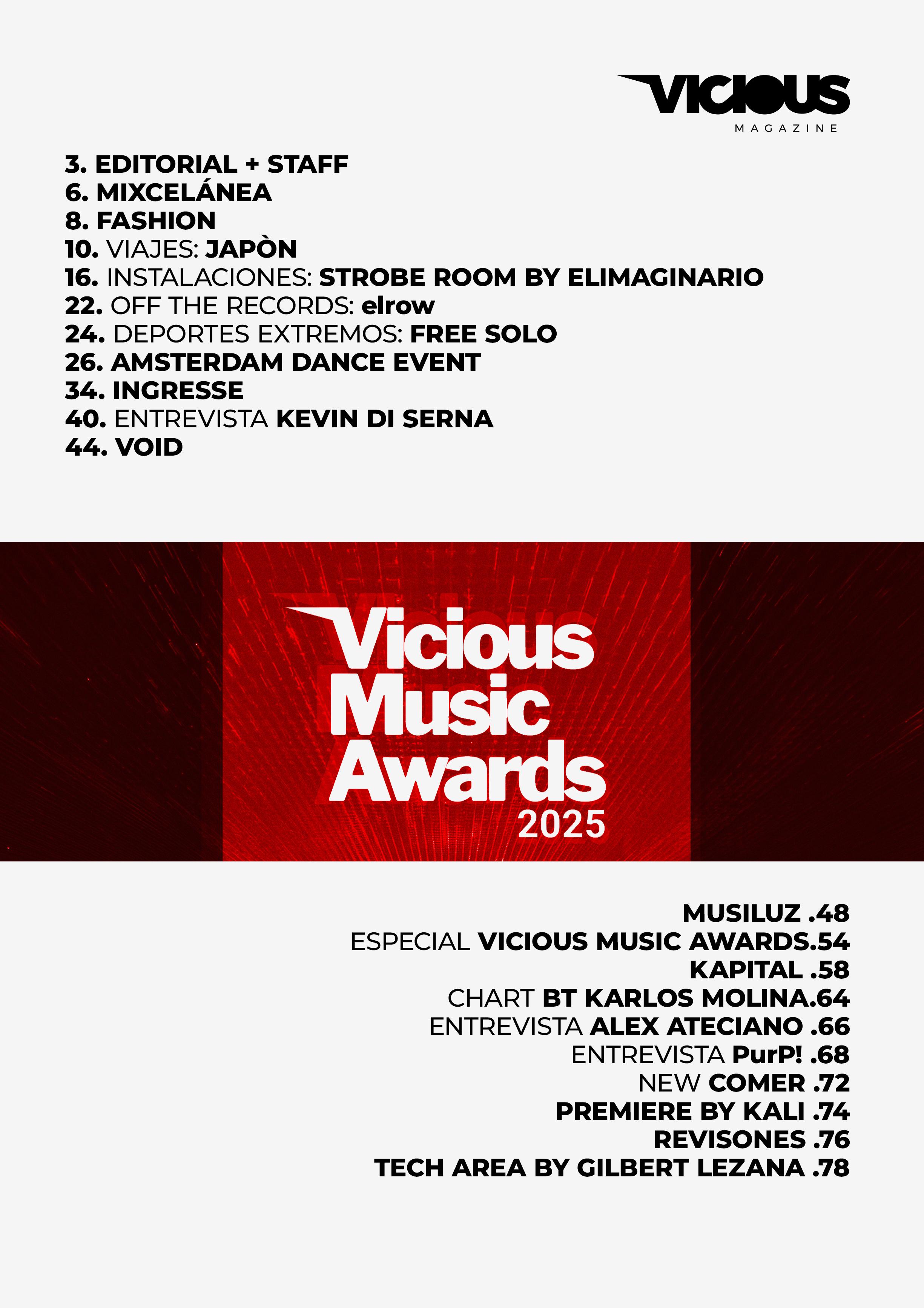 Además, entrevistamos a Alex Atenciano, Purp! y a Kevin di Serna. En la sección ‘Stroberoom’ nos citamos con los finalistas a la categoría de ‘Mejor artista visual’ en los Vicious Music Awards 2025 premios; os ofrecemos las mejores premiers mensuales del gran Kali y disfrutamos de la tech área de Gilbert Lezama. Y, además, en la sección ‘Newcomer’ te descubrimos a Paulittahh y, como todos los meses, Karlos Molina nos ofrece su excelso ‘Chart Vicious’.