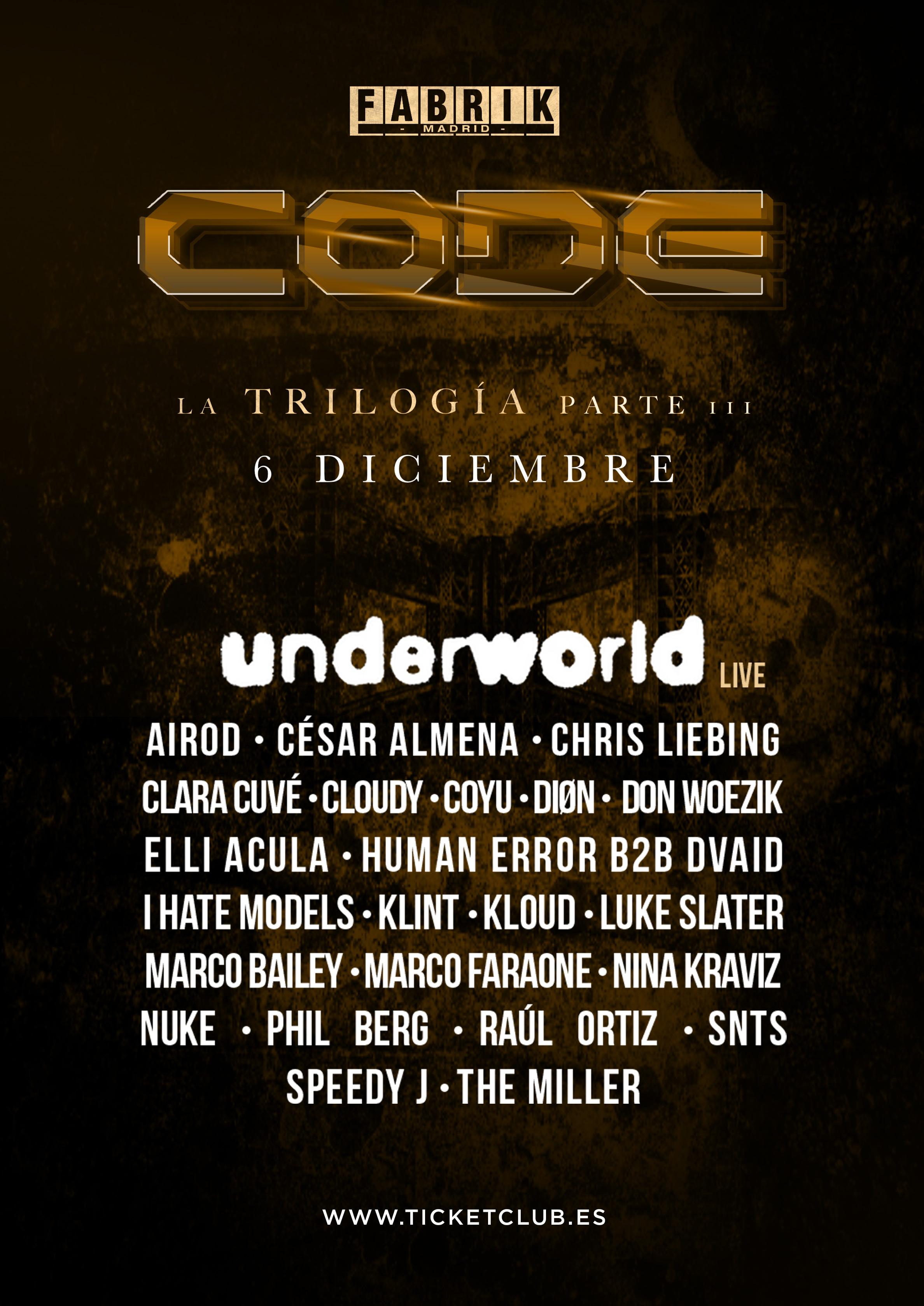 Fabrik despedirá la trilogía CODE con un cartel de altura: Underworld como gran reclamo, diez años después de su última visita a Madrid, y nombres clave del techno y hard dance como SNTS, I Hate Models, AIROD, DIØN, Chris Liebing, Luke Slater y Nina Kraviz. Una noche para cerrar por todo lo alto uno de los capítulos más ambiciosos de la marca.