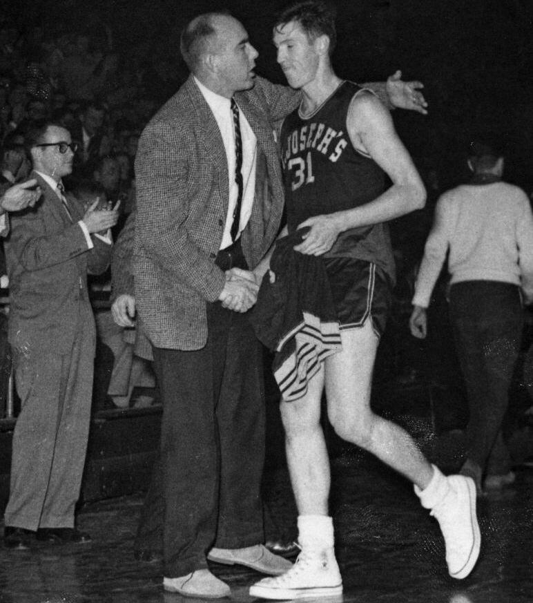 Jack Ramsay (here with Joe Spratt) led his Hawk teams to 10 postseason appearances in 11 years, with a Final Four berth in 1961.