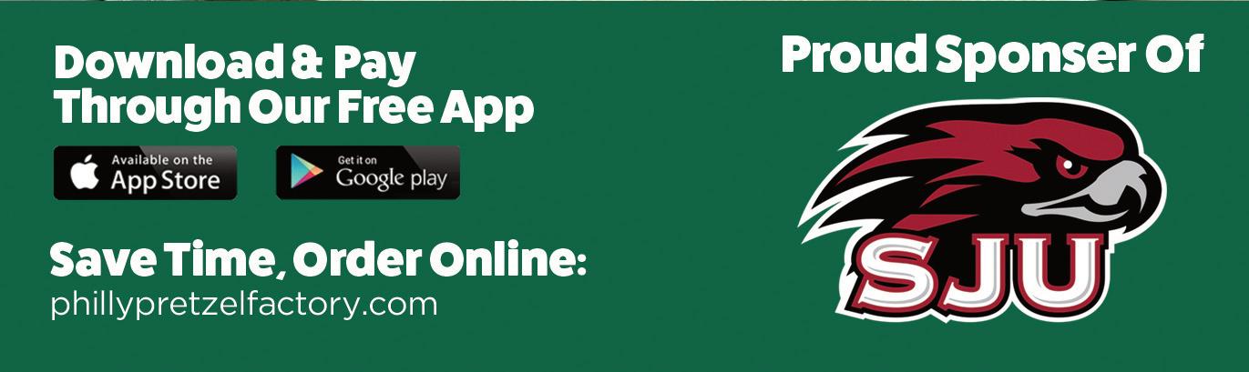 GOOD LUCK ST. JOSEPH’S FROM YOUR FRIENDS IN BUSINESS Integrated Marketing Agency Good Luck This Season! Media Works is rooting for you! 1425 Clarkview Road | Suite 500 | Baltimore, MD 21209 443.470.4400 P Palmer Masonry Restoration Exterior Masonry Restoration Specialists (215) 464-4222 BRIAN PALMER 2175 Bennett Road Philadelphia, PA 19116 Website: www.palmerinc.net WEDELIVER CallAhead! WespecializeinFASTTake-outandDelivery services Monday – Wednesday 11am - 10pm Thursday – Saturday 10am – 11pm Sunday 11am - 10pm 215-508-1050 114LeveringSt., Philadelphia, PA19127 www.franzonesmanayunk.com KitchenHours