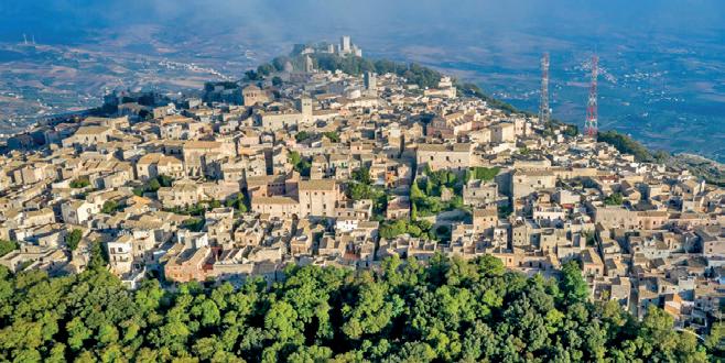 Sobre el Monte San Giuliano, a 751 m de altura surge Erice, cuyo nombre deriva del sículo-itálico Eryx, que signi fica ‘Monte’. El panorama que se obtiene desde la ciudad es sin duda uno de los más bellos de Sicilia, con vistas de las salinas de Trápani y las islas Egadi al fondo y si la niebla lo permite y los ojos se esfuerzan, la vista desde lo alto de Erice nos permitirá alcanzar el volcán Etna y hasta Túnez al otro lado del mar y ya en la costa de África y sin mirar tan lejos Trápani se abre al mar en las faldas de la montaña y por el otro costado, Valderice, hacia el golfo Castellammare.
