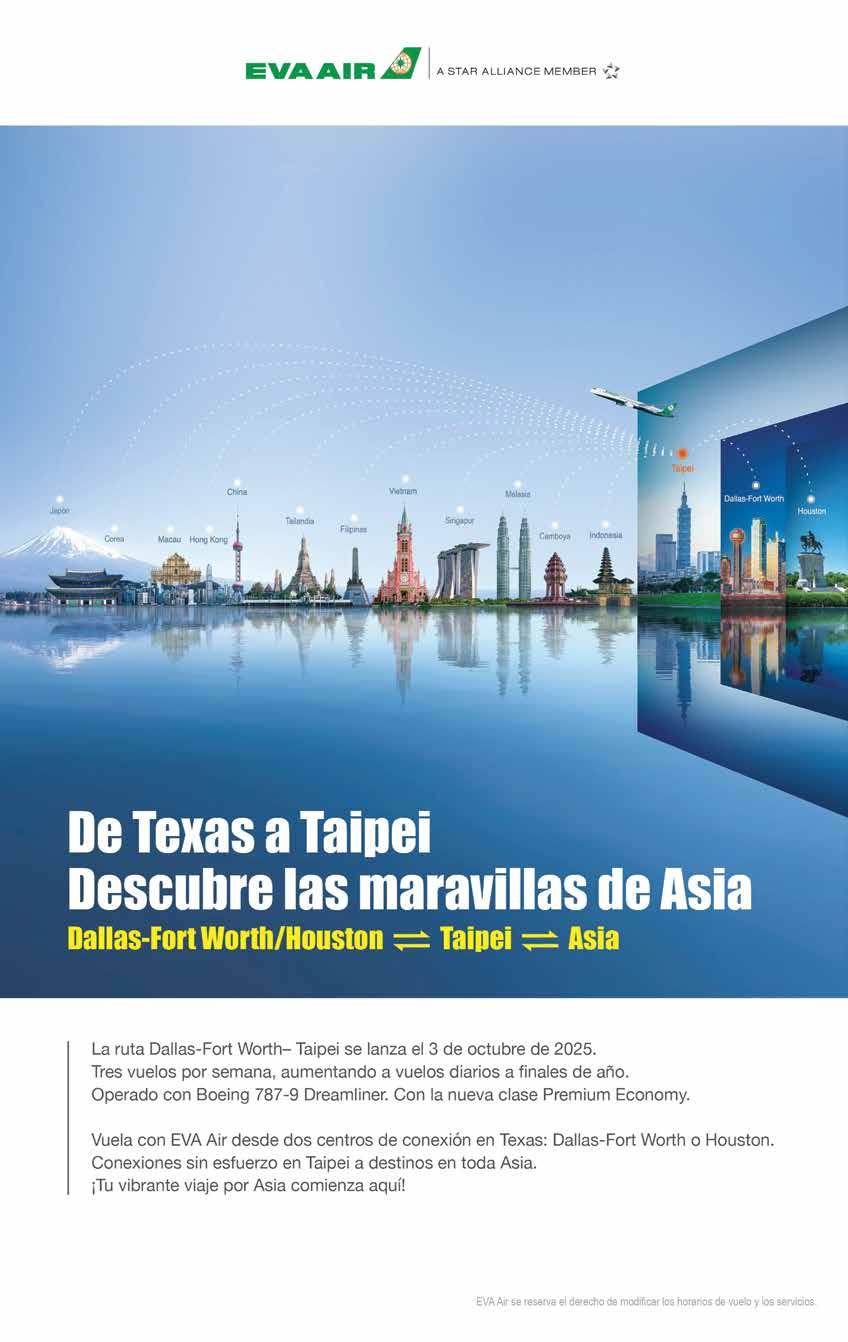 Este octubre, EVA Air le invita a reinventar los viajes de larga distancia. Con conexiones fluidas que abarcan desde Texas hasta los destinos más emocionantes de Asia, y una experiencia Premium Economy que redefine la comodidad en cabina media, el viaje se vuelve tan cautivador como el destino.