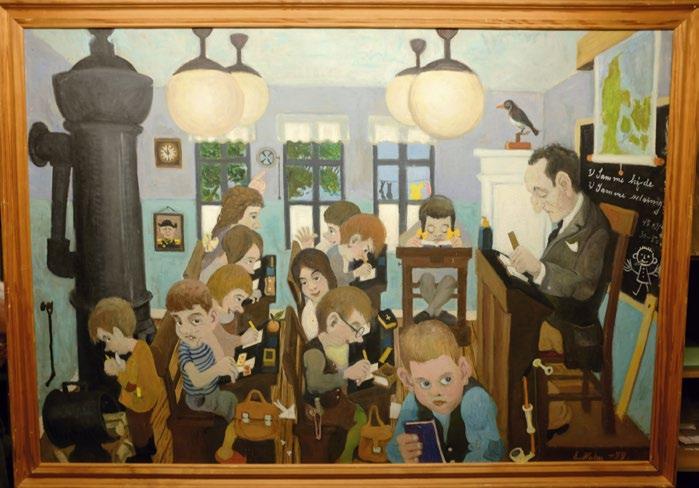 Erik Holm (1925-1989) var læreruddannet og fungerede i en tid, som vikar på Tulstrup Skole og boede i huset overfor skolen. I 1979 malede han to billeder fra undervisningslokalet, som viser hvordan undervisningen foregik i 1940-50'erne. Af pladshensyn har vi kun medtaget det ene maleri, som ses på næste side.