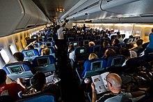 Travelers in a British Airways 747 airplane. Air travel is a common means of transport.