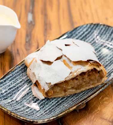 Besser als von Oma? Challenge accepted! Bestellen Sie den hausgemachten Apfelstrudel mit Vanillesauce aus unserer Patisserie und genießen Sie die Traditionsnachspeise als krönenden Abschluss Ihres Festessens.