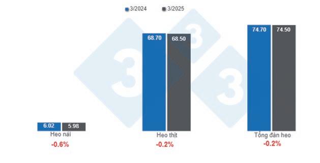 ☐ Theo số liệu điều tra của Chi cục Chăn nuôi, Thú y và Thủy sản Bình Dương, tính đến ngày 5/3/2025 tổng đàn trâu trong toàn tỉnh là 1.758 con, tổng đàn bò 15.254 con, tổng đàn heo 832.646 con, tổng đàn gia cầm trên 13,5 triệu con. Trong quý I/2025, các cơ sở, hộ chăn nuôi trên địa bàn tỉnh đã cung cấp cho thị trường 5.717 con trâu, bò, tương đương 457,3 tấn; 693.199 con heo, tương đương 51.989,9 tấn; 8.191.832 con gia cầm lông, tương đương 17.102,8 tấn; 172 con dê, tương đương 2,1 tấn.