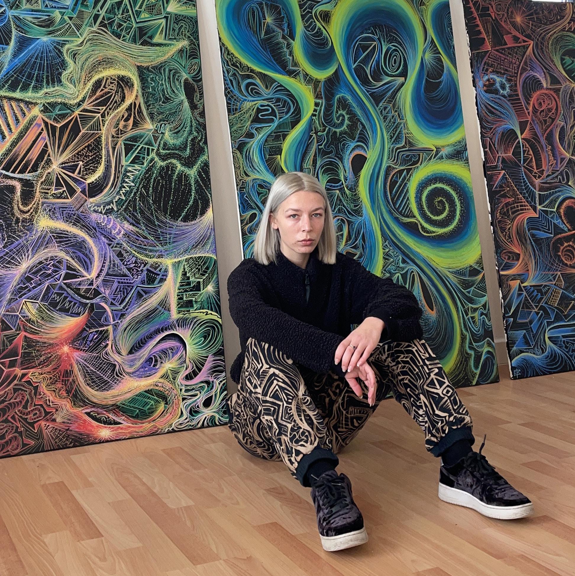 Focusing on the process rather than the outcome, she uses music and a meditative approach to create otherworldly works with no planning. Her work is created only with permanent mediums as she insists there are no mistakes when creating. Hollyâs main inspiration is nature, experience, and freedom; she sees her work to be a visual metaphor for life and the mind. Her process often uses rhythmic auditory stimulus to allow a âfree-flowâ state.
