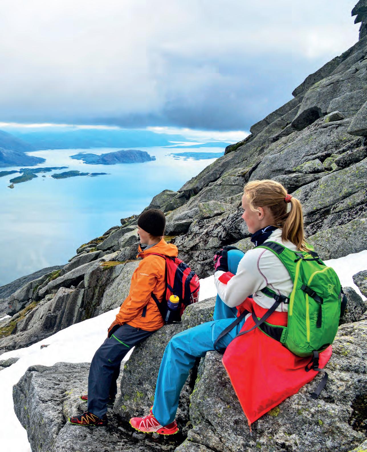 slakt oppover på en god sti, med havet og Dønnamannen i ryggen. Men etter hvert blir det brattere, et par steder så bratt at det henger tau ute som vi kan dra oss oppover med. Da vi nærmer oss toppen av Botnkrona kommer tåka sigende inn. Og her som man egentlig kan se både Vegaøyene, Torghatten og på en god dag til og med Lofoten. Kanskje vi har mer hell på neste topp. – Vi rekker i hvert fall fire, konkluderer selskapet etter en rask titt på kartet. For videre fra Grytfoten ligger Skjæringen (1037 moh.) og deretter to av de mest tilgjengelige toppene – Tvillingene på 945 og 980 moh., som er det mest barnevennlige alternativet. Og vel oppe på Grytfoten blir vi belønnet med et skydekke som sprekker opp og viser frem Nordlands natur på sitt vakreste med fjorder, fjell og et mylder av øyer ute i havet. Men det holder med to –tvillingene får vente til en annen gang. ●