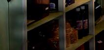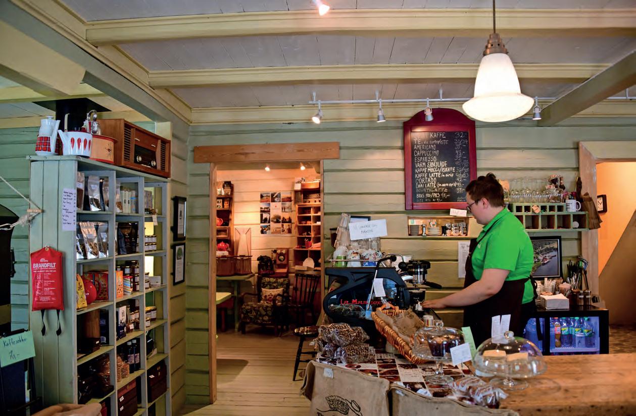skilt, historiske bilder på de lafta veggene, fargepalett fra tidlig i forrige århundre og en rekke regionale varer som multesåpe fra Alveland i Vesterålen, gammeldags godteri i kremmerhus, gulrot- og ingefærte og egenproduserte honningvafler.